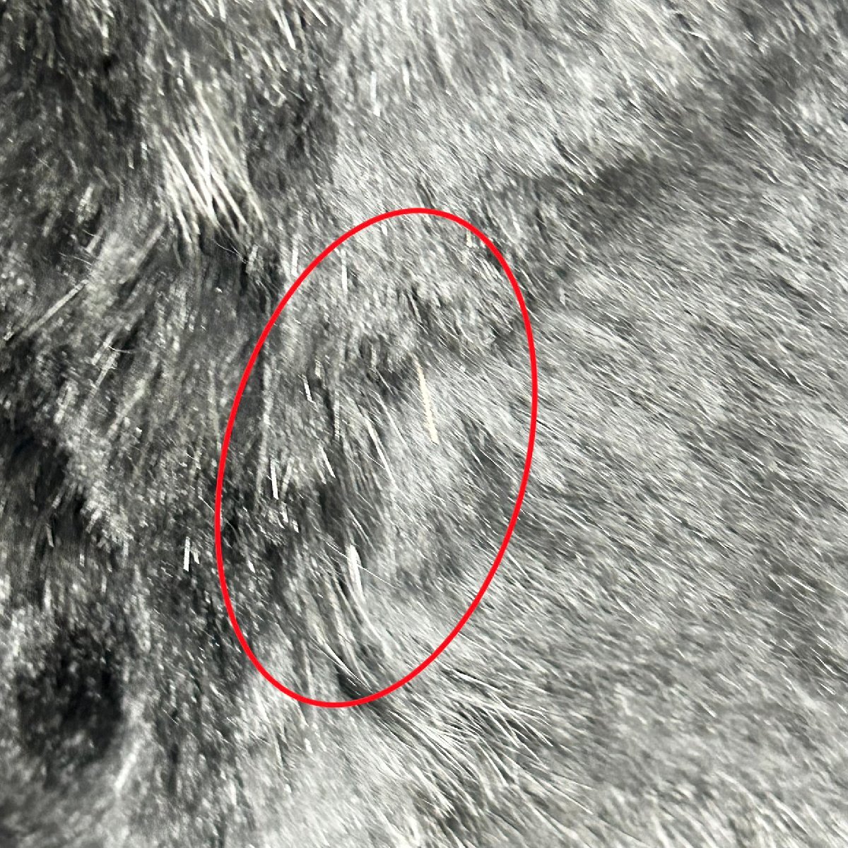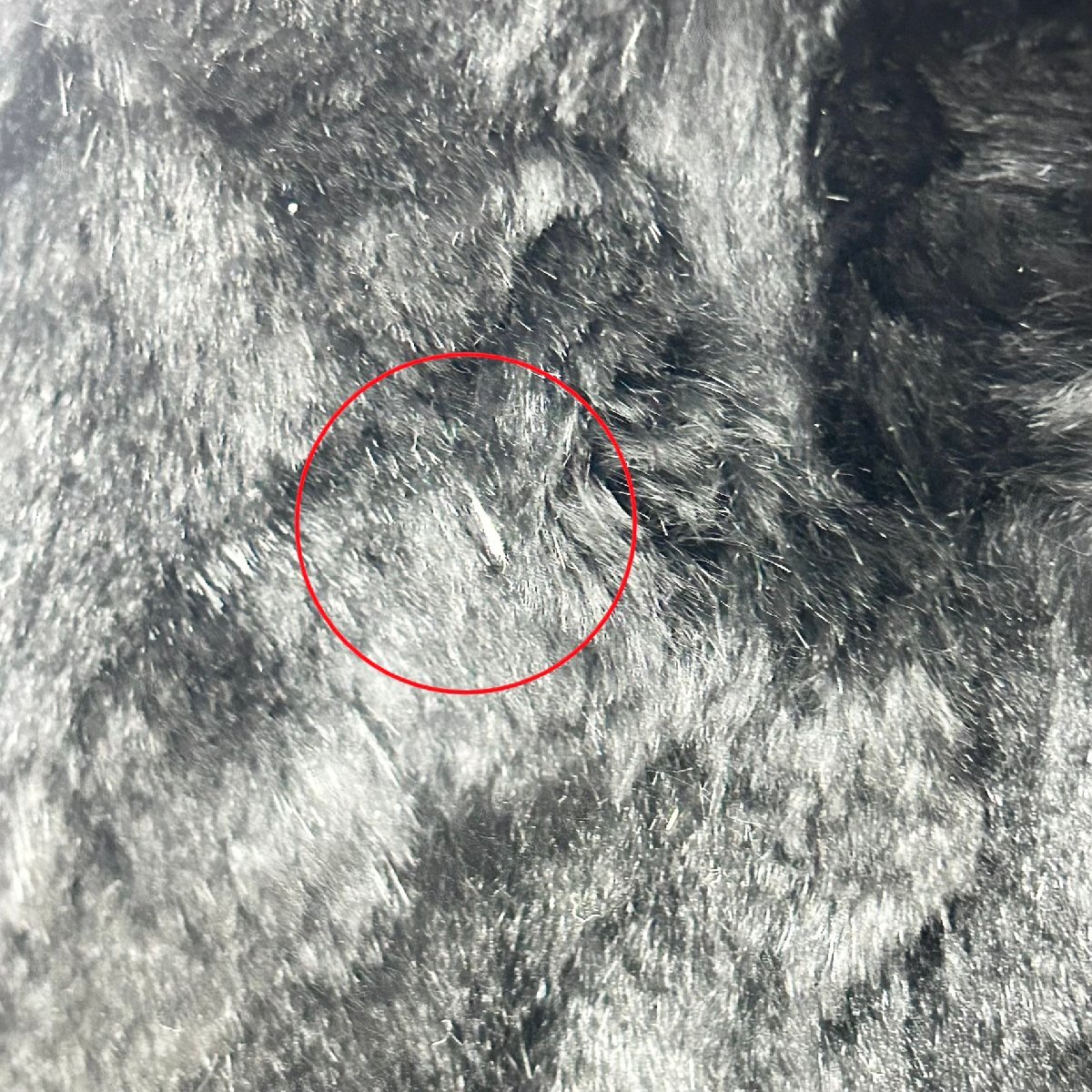 ・所々黒以外の毛色の糸の飛び出し、毛乱れ、内側の素材が見える箇所あり