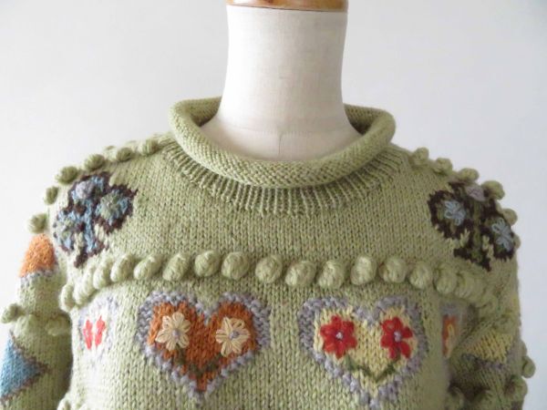 | 詳細 | 中手の編み伸縮地です。気持ちのいい肌触りの素敵なソフトタッチニットです。パステル草色グリーンに多彩な模様を編み入れてゆったりとしたラインを可愛さと主張のあるムードで丁寧に仕上げてあるニットトップです。 状態は綺麗なものです。 |