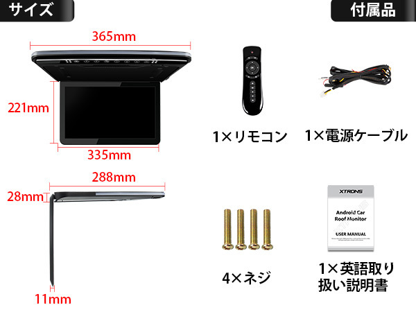 XTRONS Android 超薄型 フリップダウンモニター 登場! ※ 13.3インチ 大画面 水平開閉150度 ※ 超薄型/超軽量設計 わずか2.8CMの薄型設計+1.8KGだけの軽量設計で、 車の天井への負担も軽減されます ※ 8コアAndroid9.0システムが導入 WIFIに繋がると、YouTubeなど様々なAndroidアプリを 自由に楽しむことができる ※12V車対応 軽自動車や普通車にとって、サイズが最適 ※購入日からの1年保証付き、ご安心ください。 |