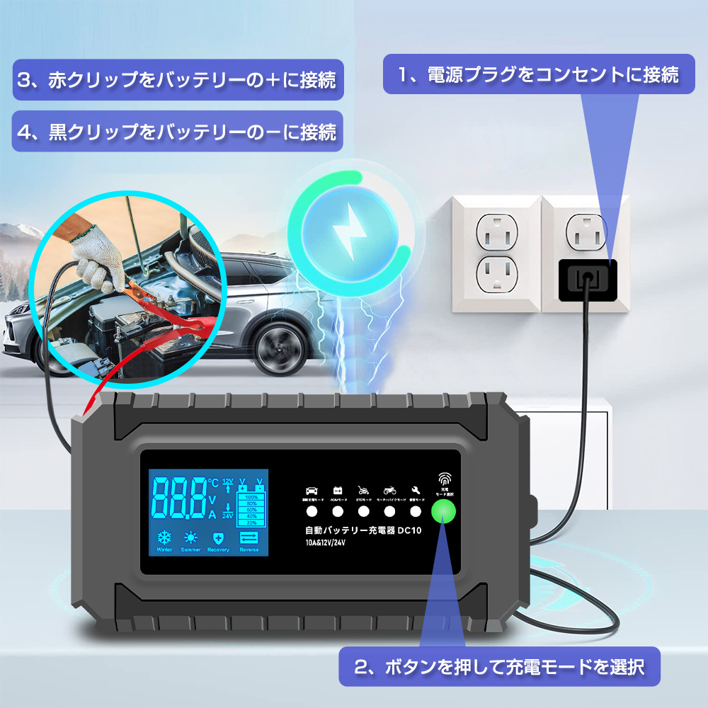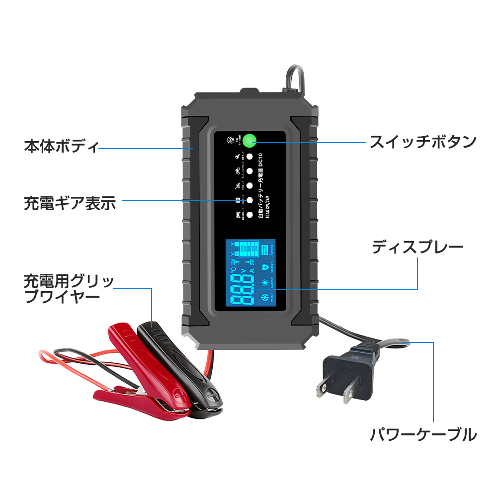 ●充電機能:全自動充電・バッテリー診断 ・急速充電・満充電後自動に停止機能 ・3段式充電(恒流充電 恒充電 浮動充電)