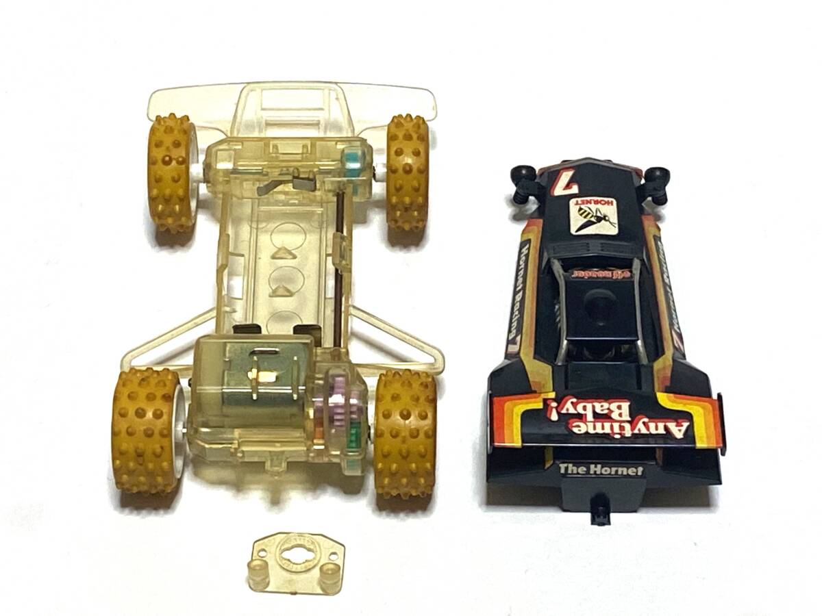 タミヤ・レーサーミニ四駆 ・限定品・絶版希少品・KIT.No 2952【ホーネットJr (透明シャーシ・カラータイヤ)】です。透明穴無しバンパー・イエロースパイクタイヤです。一部塗装済み・タイヤ亀裂・硬化有り・シャーシ黄ばみ有り・シール色落ち有。組み立て済みの中古品となります。現状渡し・ノークレームでお願いいたします。コレクター・マニア向きです。発送は「ゆうパック」のみの発送となります。■新規の方・評価にマイナスが有る方のご入札は当方判断にて削除する場合がありますがご了承ください。また新規の方・評価5以下の方の落札の場合24時間以内に取引ナビにて落札者様からのご連絡をお願いいたします。ご連絡無き場合は落札者都合にて削除させていただきます。■■落札者の方はヤフーからの落札通知を必ずご覧下さい(特に同梱・お取り置きをご希望の方は24時間以内のご連絡を必ずお願いいたします。ただし評価20以下の方のお取り置きはいたしません。)■■ ※※【評価が新規の方にお願い】新規の方はご入札前必ず質問欄からご購入の意思をお伝えください。連絡無きご入札の場合全て削除いたします。最近新規の方のいたずら入札が多い為ご理解ください。※※■■※(いかなる場合でも入札の取り消しはいたしません。よく考えてからのご入札をお願いいたします)