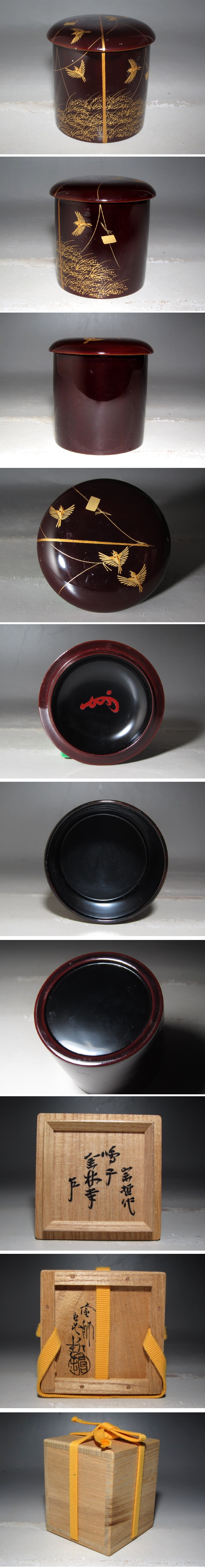 ○商品説明○ 千家十職中村宗哲作の鳴子蒔絵金輪寺棗です。 大変趣ある姿のお品です。 蓋裏に表千家十三代即中斎の花押があります。 底部に針銘があります。 ○中村宗哲(なかむらそうてつ) ○ 千家十職の塗師。 中村家は、400年近く続く塗師の家。 明治時代以降は茶道具の塗師専業となっている。 現当代は2006年十三代中村宗哲を襲名。 ○サ イ ズ○ 直径7cm/高さ7.5cm(多少の誤差はお許しください) ○状 態○ 無疵である事は確認しておりますが、時代のスレ等ある場合があります。 写真で良くご覧頂き気になる個所が御座いましたらご質問下さい。 ○決済方法○ かんたん決済 ○発送方法○ 佐川急便元払い 全国一律1,000円 北海道1,500円 沖縄2,000円 離島2,500円 複数点ご落札頂きましても、一点分の送料で結構です。 | ||