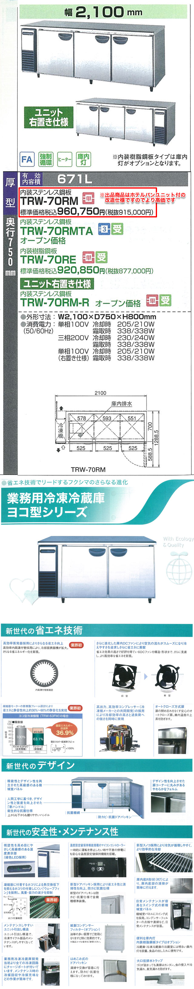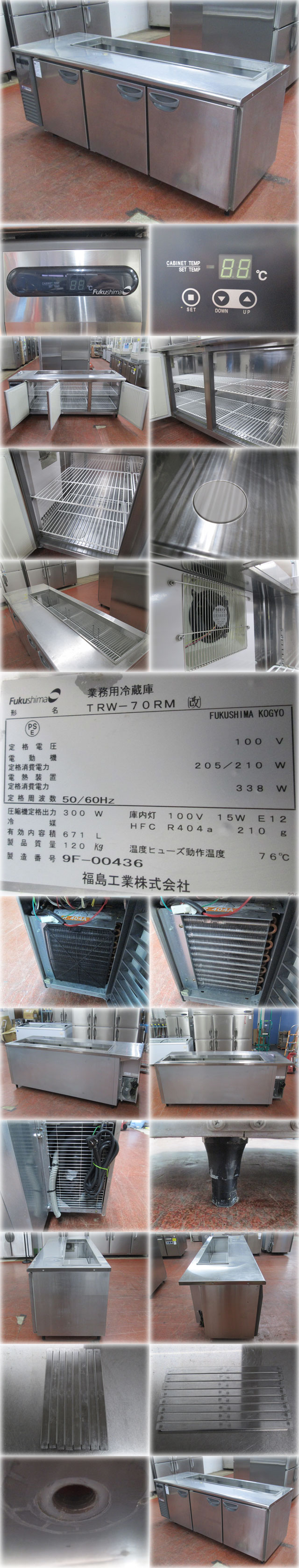 フクシマ サンドイッチ冷蔵コールドテーブル TRW-70RM(改) を出品いたします。 ■特徴■ 省エネ技術でリードする フクシマのさらなる進化 高効率蒸発器採用によりさらなる省エネ向上 高効率内面溝付管採用により、 冷却面表面積が拡大。 さらなる省エネルギー化を実現。 さらに進化した庫内DCファンにより空気の流れが スムーズになり冷えやすさを追求しさらに省エネに貢献 省エネ効果の高さで好評を得ているDCファンを構造・形状まで、 さらに見直し、より効率的な省エネを実現。 温度設定値保持機能搭載のマイコンコントローラー 一時的に運転を停止したい時や不意の停電にも 安心な温度設定値保持機能を搭載。 ホテルパンユニット付の改造仕様です。 ■仕様■