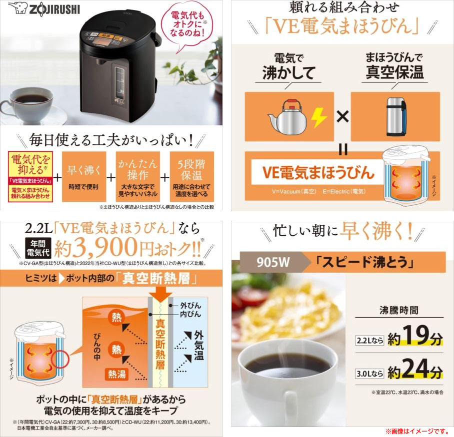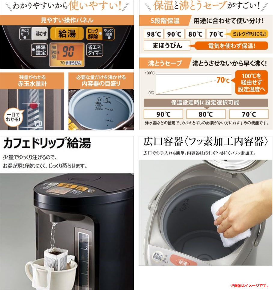 【商品特長】 ◆3枚のステンレスの壁でサンドイッチされた「真空断熱層」と 「空気断熱層」の2つの層により保温効果を高めた、電気ポット。 ◆沸とうさせずに設定した温度(90・80・70度)まで沸かして保温できる「沸とうセーブ」機能を搭載している。 ◆2時間操作がないときは自動で保温ヒーターへの通電を切る「省エネモード」搭載で、消費電力量を削減できる。 | |||||||||||||||||