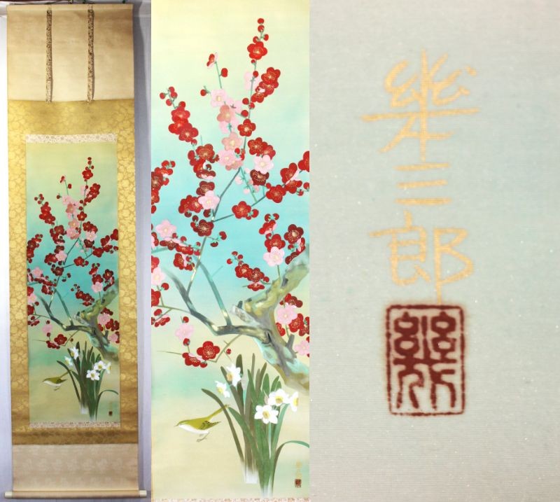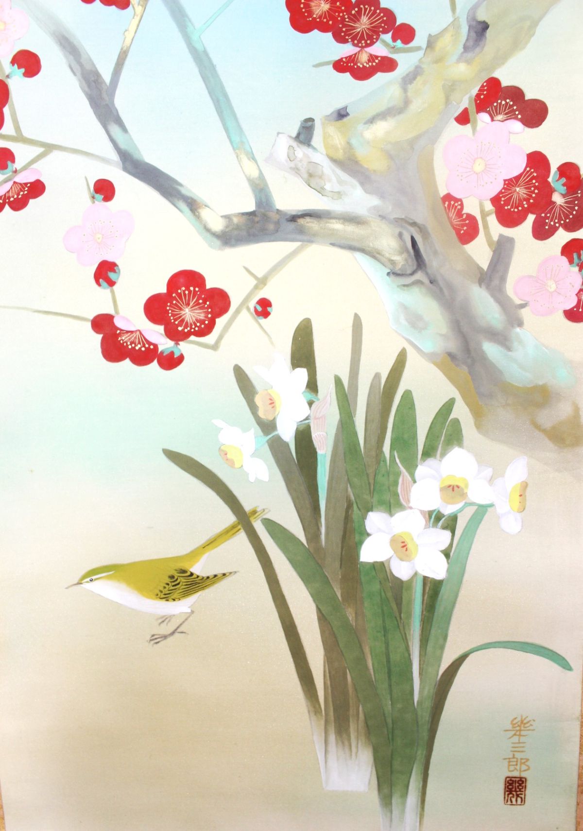 愛らしい丸い梅の花.美しい水仙と鶯の姿