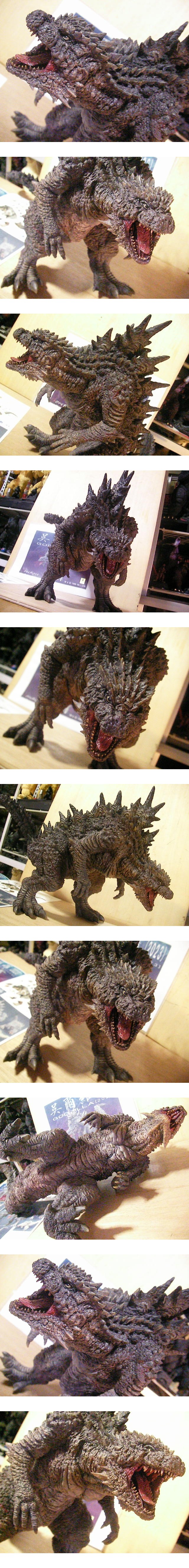 當幸宗氏原型 レジン 背ビレまでの高さ26cm 鼻先から尻尾まで53cm 元箱の背表紙・完成見本写真掲載のインスト付き。大戸島に出現した呉爾羅を約40cmサイズで立体化したキットです。劇中では夜間での登場の為、実像に余白が生まれ発売されている呉爾羅はカタチも色も様々です。そんな中で個人的に最も面白い造形だと思ったのがこちらになります。低く攻撃態勢を取った姿に迫力があり筋肉の動きも的確に捉えられていて野性味と躍動感も感じられる素晴らしい物になっているからです。製作では各パーツに真鍮線を入れながらパテを盛って完全につなぎ目を消して組み立てました。塗装では皮膚は恐竜のような硬くて乾いたように見えるよう5,6色の色を配分。クドいドライブラシは極力避けながら自然の光の当たり具合でも凹凸が浮き出るように工夫して塗ってみました。写真では分かり難いのですが足や脇腹、尻尾等に傷の赤を加えてあります。尾中周りはグレーやベージュの明るい色味です。背ビレはGOWROWさんの作例よりも黒に近い色にアース系の模様を入れました。口内は赤とオレンジ数色で深みとヌメリを。最後に目の塗装。赤黒いアイラインを引いて濁った白目の中に瞳は内に向かって黒い枠→オレンジ2,3色→黒い瞳孔です。キットの露出が少ないので完成品での出品は殆どないと思われます。気に入って頂けます方、このご機会をお見逃しなく!よろしくお願いします。