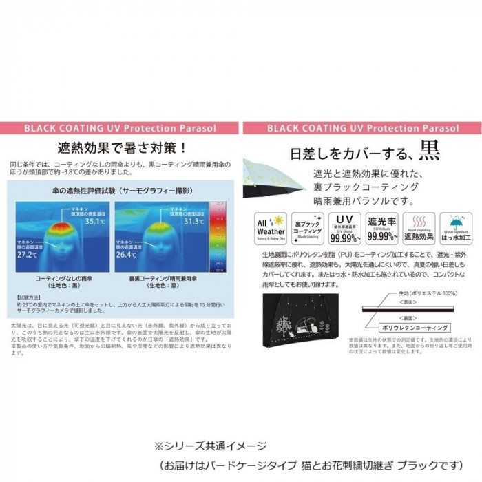 | 仕様 | 手開き 晴雨兼用 はっ水加工 遮熱効果 紫外線遮蔽率:99.99%以上 遮光率:99.99%以上 |