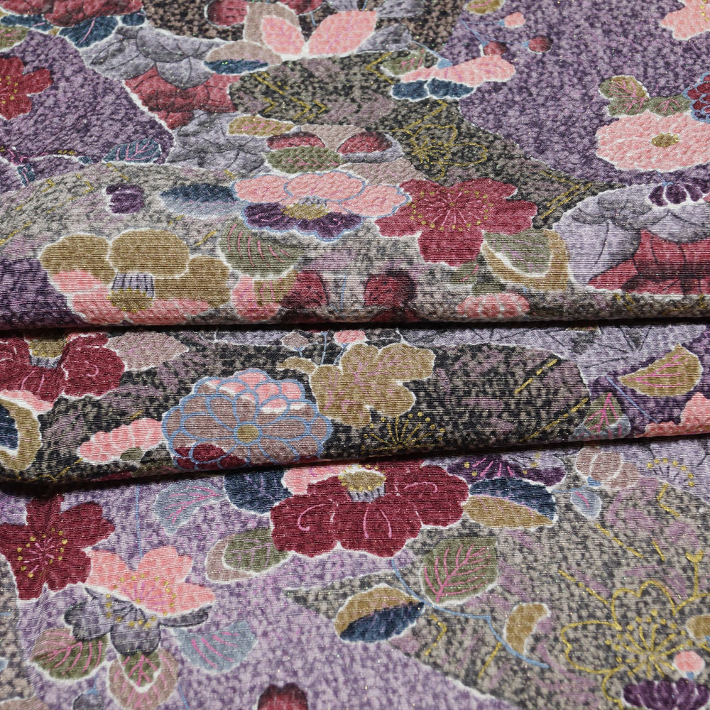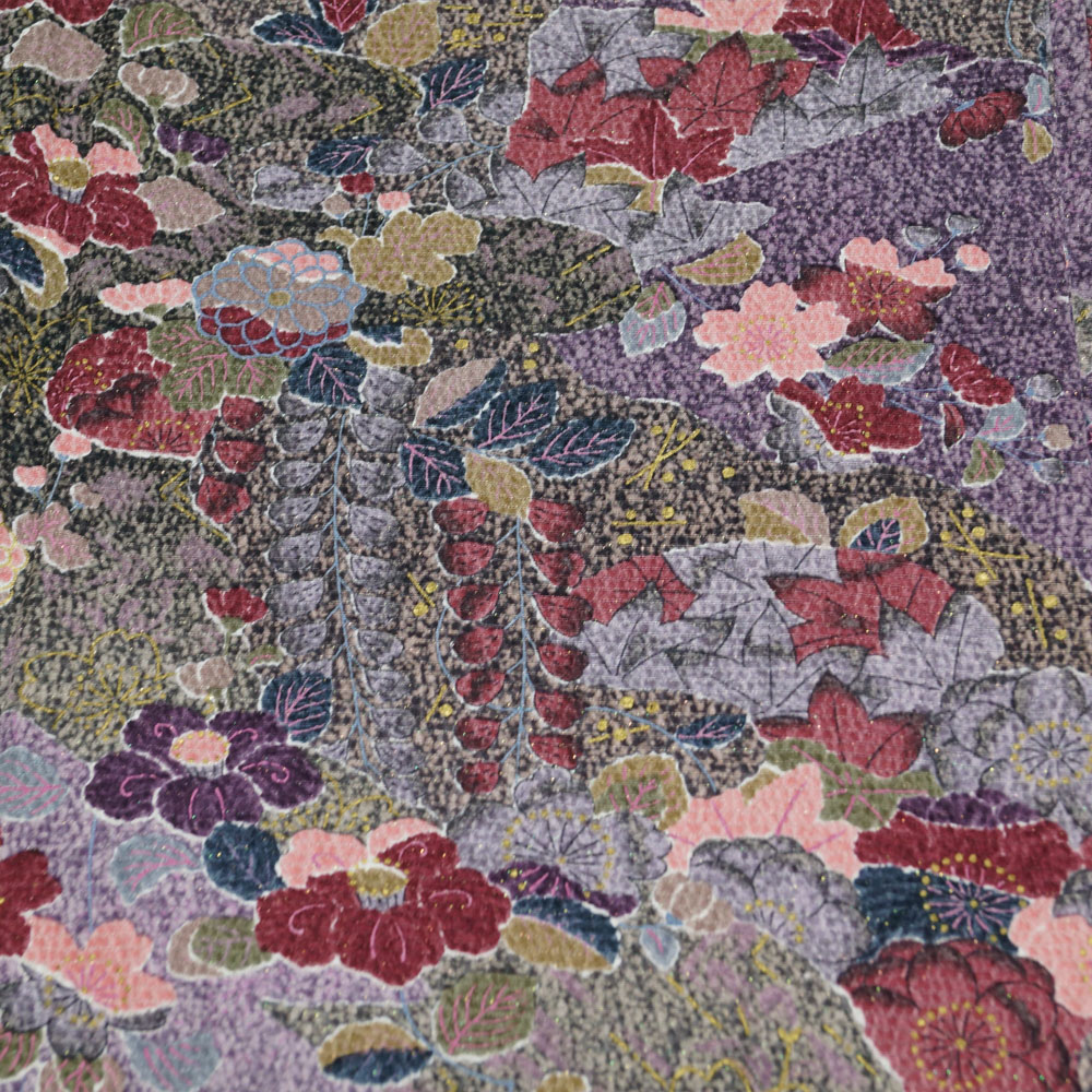 | 商品 説明 | 薄葡萄色系のちりめん地に桜や椿、菊、藤などの百花模様が染められた小紋と、瑠璃紺色系の地に菱に枝花模様が施された八寸名古屋帯、薄ピンク色系ぼかしの地にエ霞に桜や牡丹などの模様が地織された長襦袢の3点セットです。 |