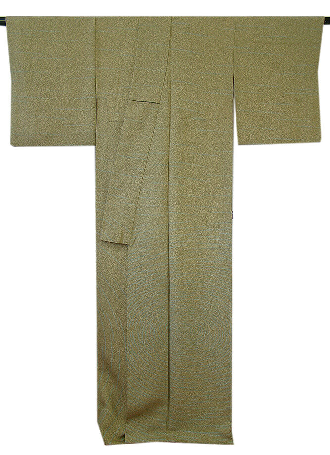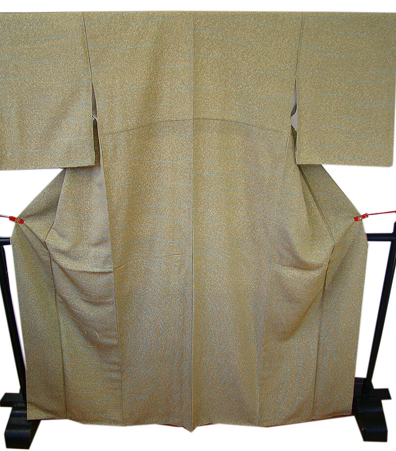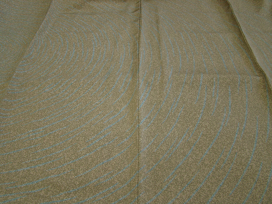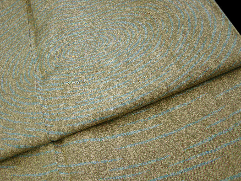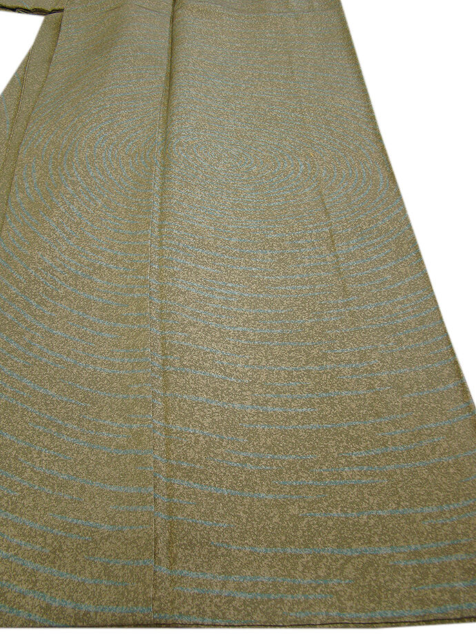 ベージュ色、海松色のたたき染に水色の鳴戸柄の染柄に金糸の刺繍入り、