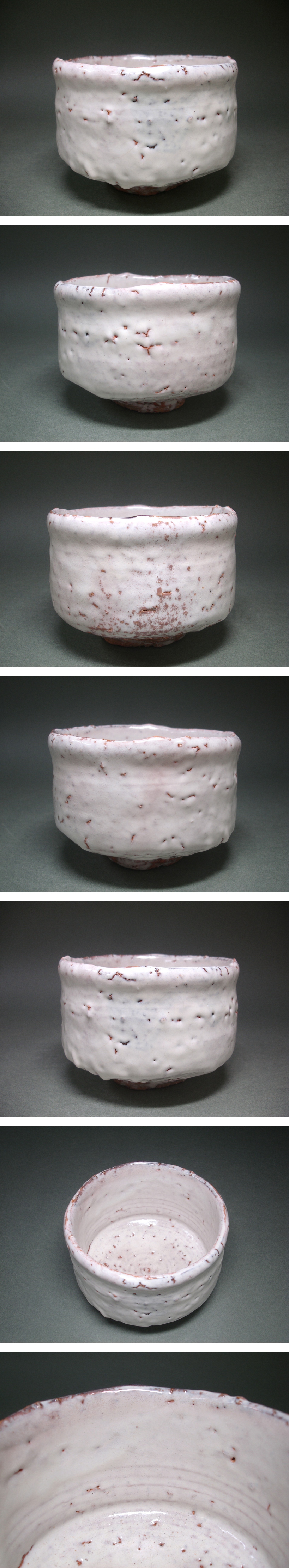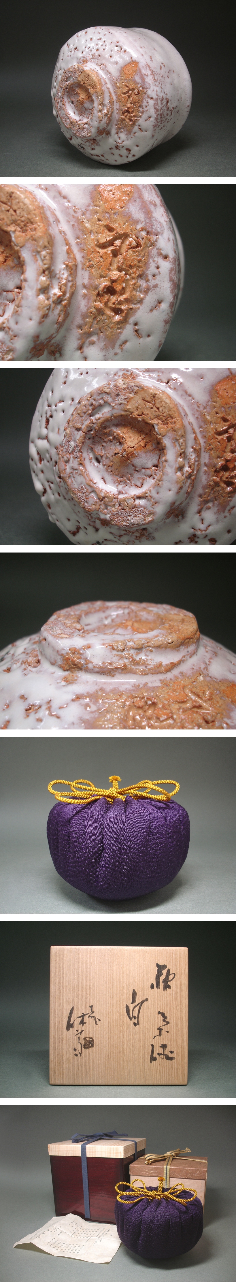 本物保証! 現代萩焼史上最高峰の名工にして名実ともに最高の評価を受ける巨匠、人間国宝【11代三輪休雪(壽雪)】(1910-2012)作。 休雪時代の「白萩手」の秀作です! “休雪白”と呼ばれる濃厚な純白色の藁灰釉をたっぷりとかけ、烈しい焼成によって生じたカイラギの中から見える地肌とのコントラストは実にインパクトがあり力強く、多大な生命感を魅せています。 それはもう、自然の大雪原のような真っ白な世界です! 大ぶりで堂々たる器形、そして荒々しくも温和で潤い豊かな釉調も何ら申し分なく秀逸です! そしてほのかに赤みを帯びた部分もあり、力強さの中に温もりもしっかりと内包させています。 とても充実した作ぶりに安心感溢れる作品です。