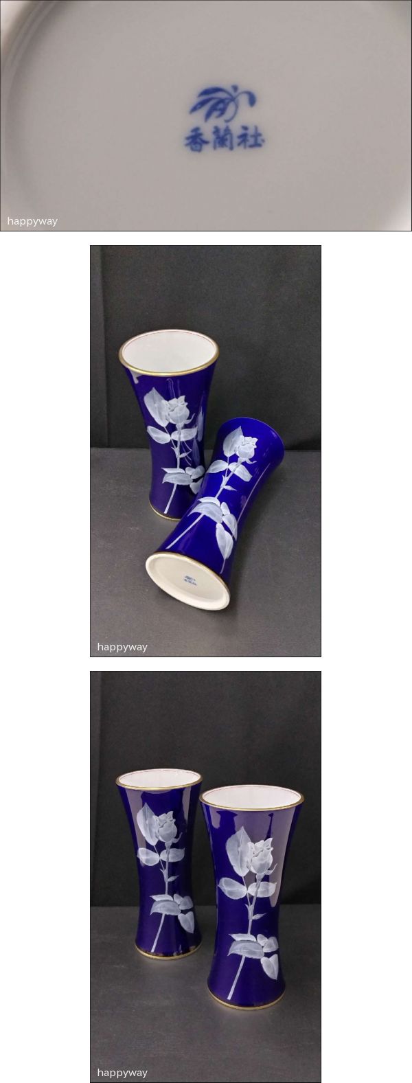 | 1円~【美品】有田焼 香蘭社 ルリローズガーデン 花瓶×2点セット 瑠璃色 金彩 高さ 約2cm×口径 約9.cm 花道具 花器【保管品】80 | ||