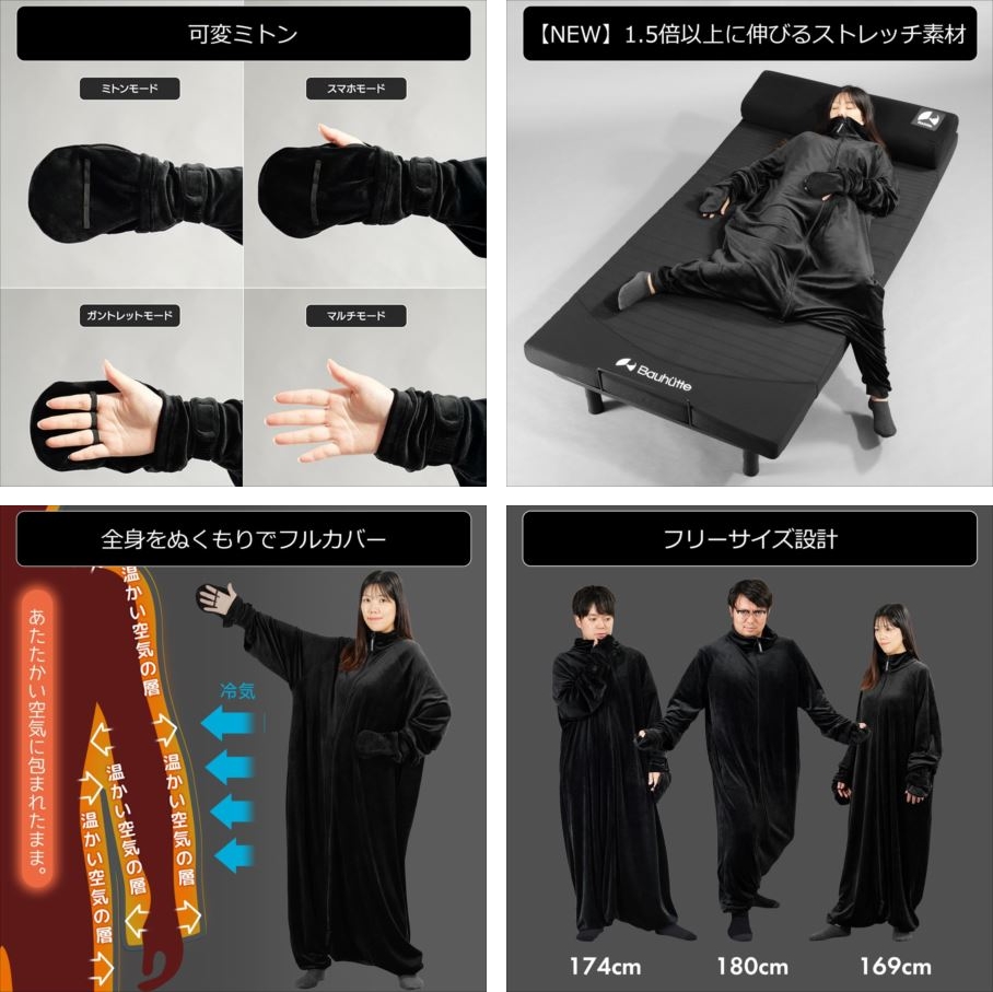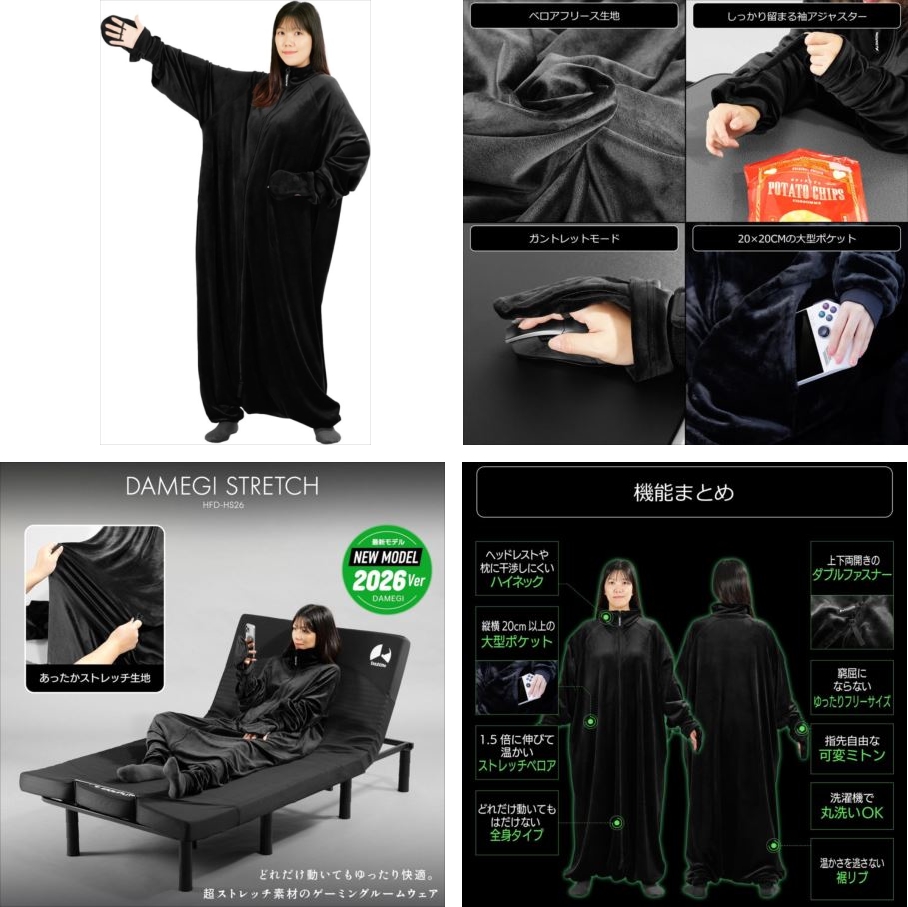 【商品特長】 ◆どれだけ動いても、ゆったり快適 温かさ&機動力を高めた「超伸びる」ルームウェアです。1日中ベッドで過ごす"廃ゲーマー"におすすめ。 ◆超ストレッチ素材 当社比1.5倍以上にも伸びるストレッチ素材を大きく採用した新感覚ルームウェアです。 寝返りや寝相による身体の動きに合わせて生地が伸縮し、締め付け感・窮屈さを感じにくくなっています。 ◆動きやすさを追求した細部設計 運動量の多い肩周り・股には充分なゆとりを確保しつつ、手足首にはフィット感を持たせることで、 歩きやすさ・動かしやすさにもこだわっています。 ◆可変ミトン 指の露出度を調整できる、独自の手袋システム。ミトンを手の甲に固定できる「ガントレットモード」では、 パソコンのタイピングやマウス操作を妨げることなく、手を冷気から守れます。 | |||||||||||||