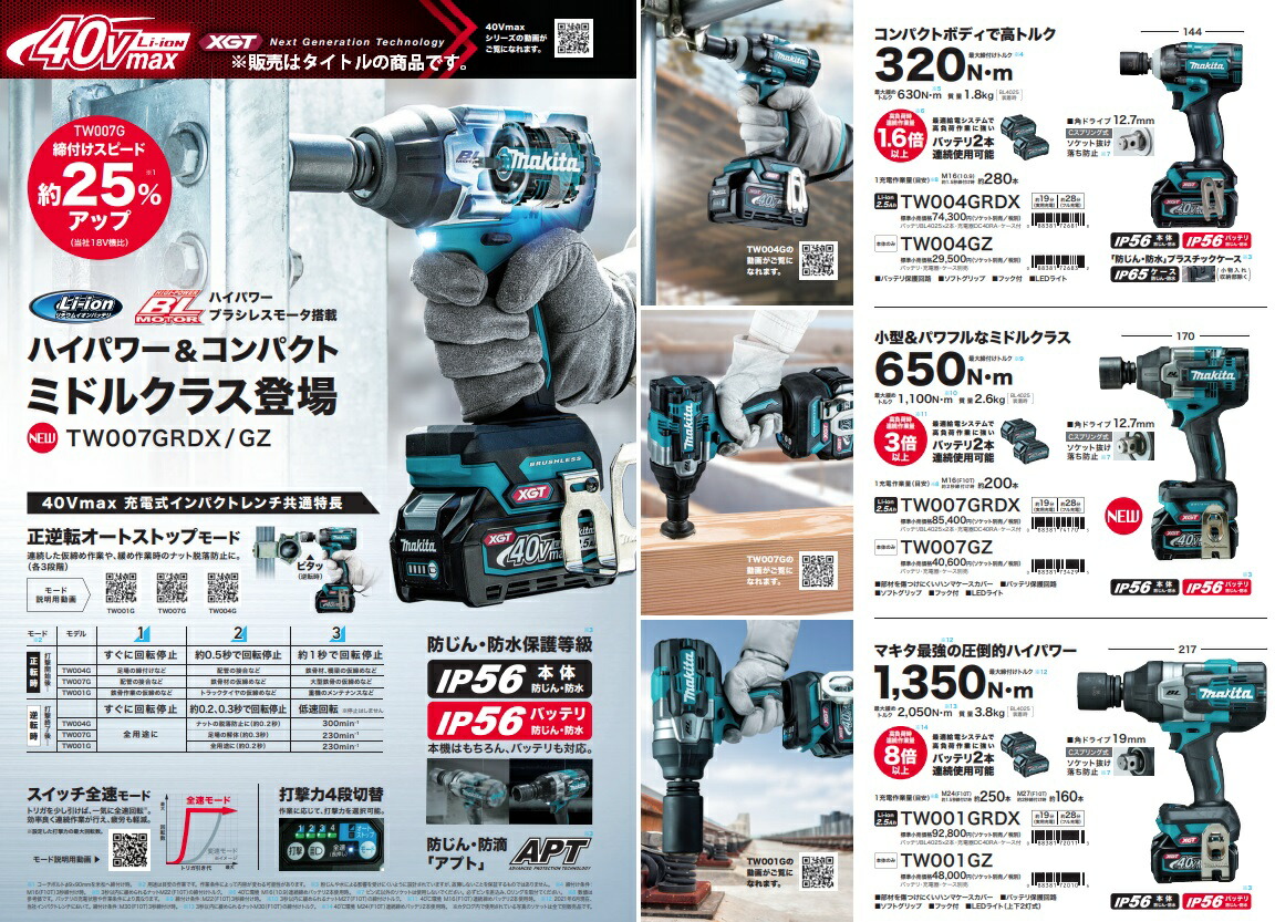 マキタ makita充電式インパクトレンチTW007GRDXバッテリBL4025x2本・充電器DC40RA・ケース付※ソケットは別販売品です88381741705■ハイパワーブラシレスモータ搭載■作業効率向上、3つのモードを搭載1.正逆転オートストップモード2.スイッチ全速モード3.打撃力4段切替■粉じんや雨から保護、防じん・防水保護等級IP56※粉じんや水に よる影響を受けにくいように設計されていますが、故障しないことを保証するものではありません。■防じん・防滴「アプト」過酷な現場環境から本機を守り抜く。※注意:水や粉じんによって故障しないことを保証するものではありません。■ソケット抜け落ち防止、Cスプリング式Cスプリングの摩擦により、 ピンを刺す前にソケットを仮保持。※注意:ピン式以外のソケットは使用しないでください。 必ずピンを差込み、Oリングを取付てください。■その他特長・角ドライブ12.7mm・部材を傷つけにくいハンマケースカバー・無段変速・正逆転切替・バッテリ保護回路・ソフトグリップ・フック付・LEDライト付マキタ makita