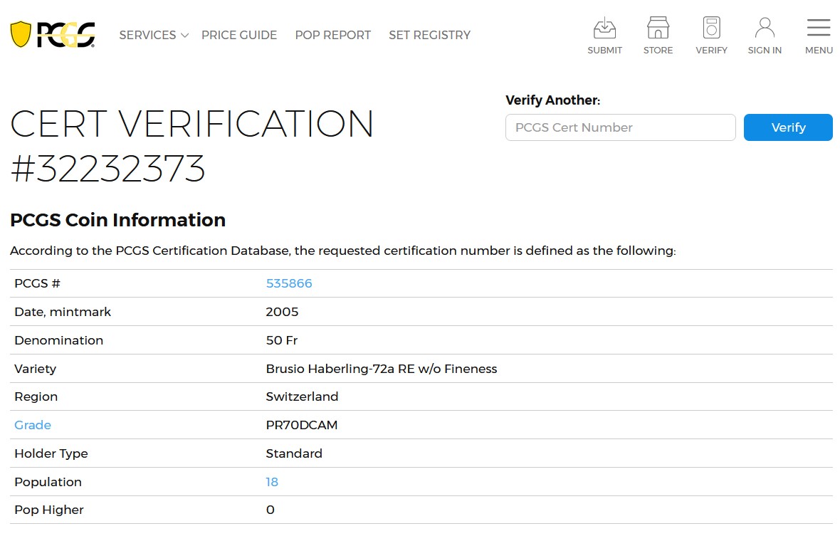 ・発行年:2005年 ・額面:50フラン ・材質:銀 ・品位:0.900 ・重量:25 g ・直径:37 mm ・鑑定機関:PCGS ・グレード:PR70 DEEP CAMEO ・鑑定番号:32232373 ・発行枚数:1500枚 ・鑑定枚数:18枚