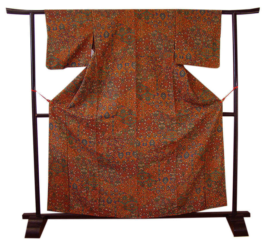 ※更紗柄の素敵な単衣の小紋です。 お茶事等に最適でしょう。 お茶事や古典芸能のお師匠さんにもピッタリ映える秀逸品です。 30代~70代迄幅広く着用出来ます。 身長146cm~152cmの貴女に最適。 |