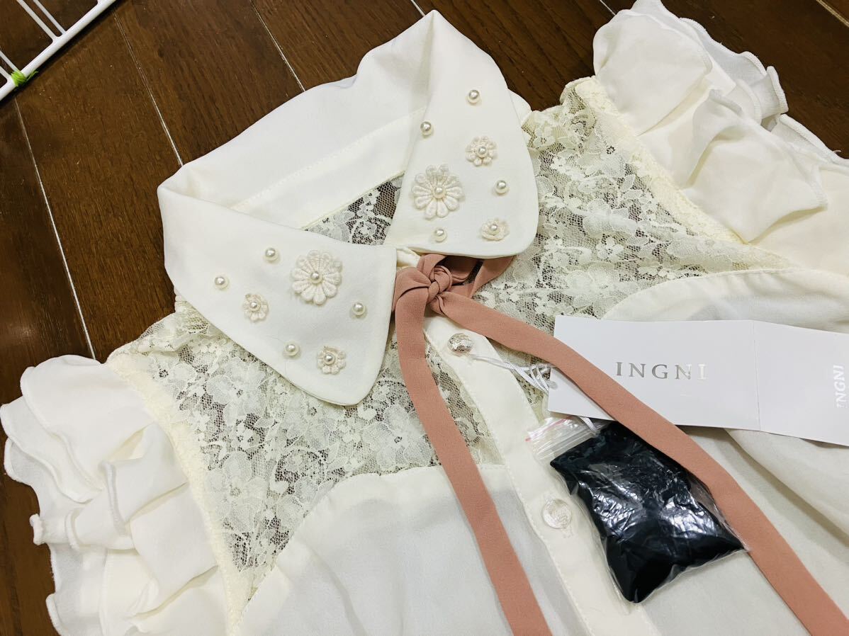 新品タグ付☆イングINGNI☆超キュートなノースリーブフリルレースシャツ☆Mサイズ☆替えができるリボン2個付☆パール☆花☆オフホワイト 收藏
