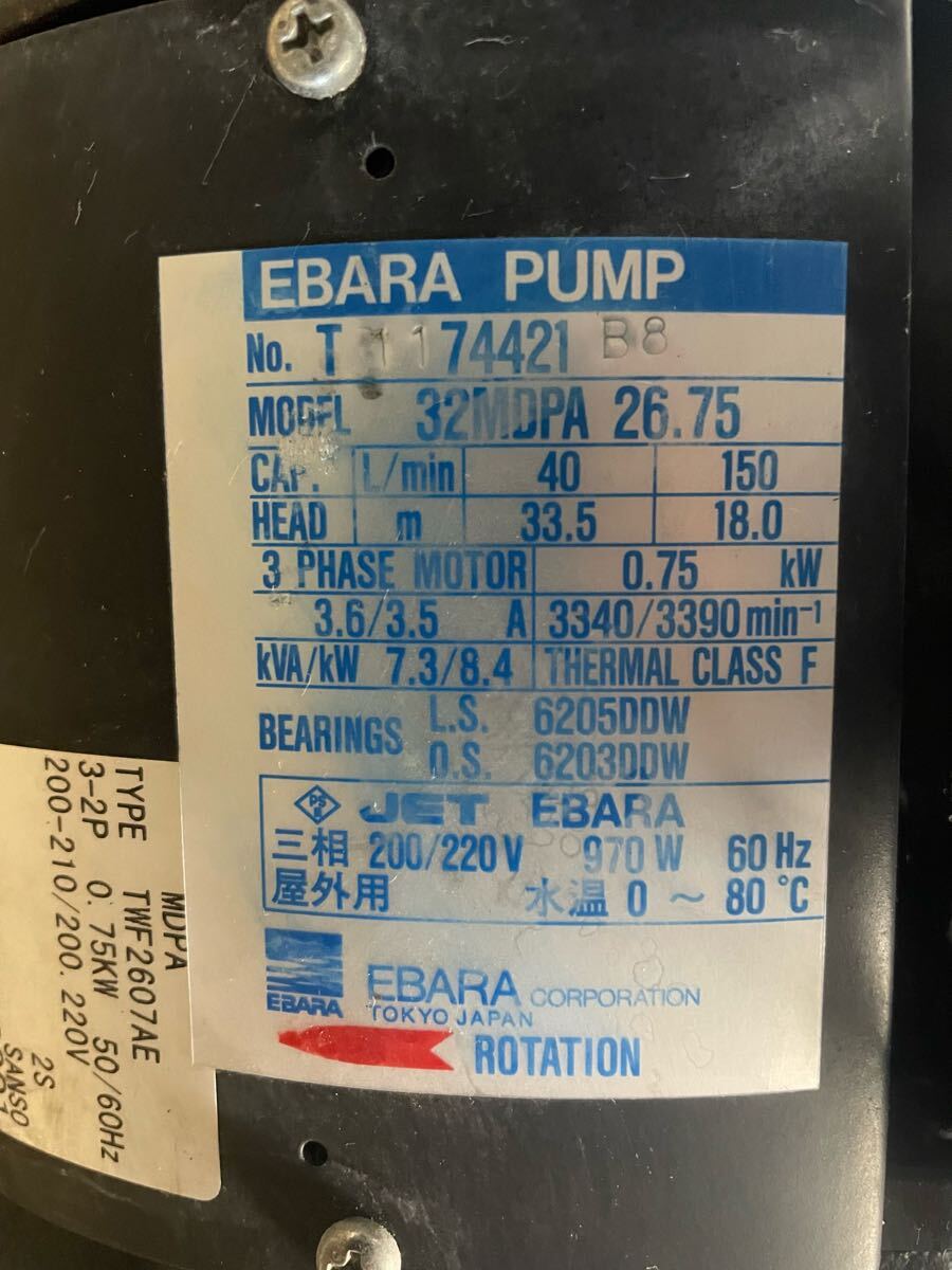EBARA PUMPエバラ/ 荏原製作所 【32MDPA26.75】陸上ポンプ 渦巻ポンプ 200/220V 970W 60Hz 中古品 通電OK モーターが回転
