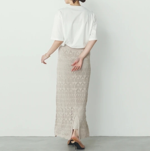 hunchハンチ ペーパーヤーン透かし編みニットナロースカート ベージュ レディース ボトムス タイトスカート ウエストゴム レース 收藏