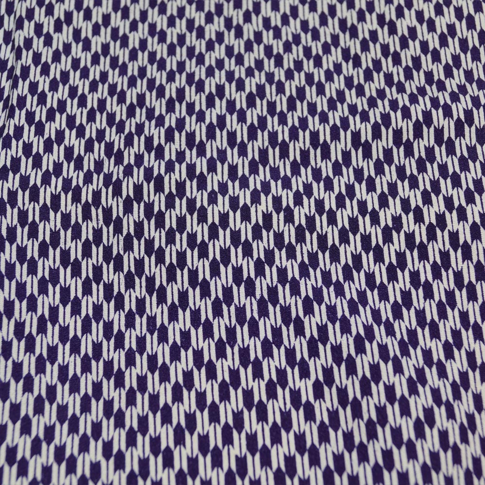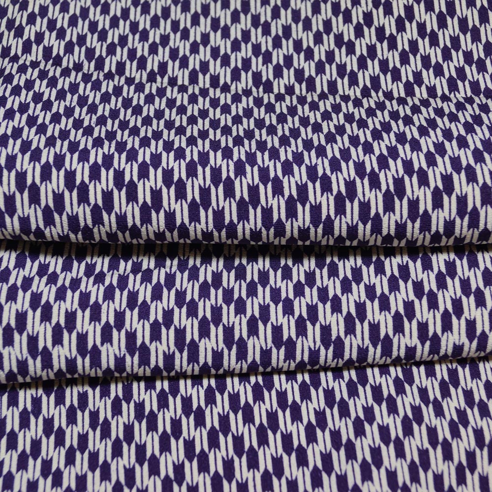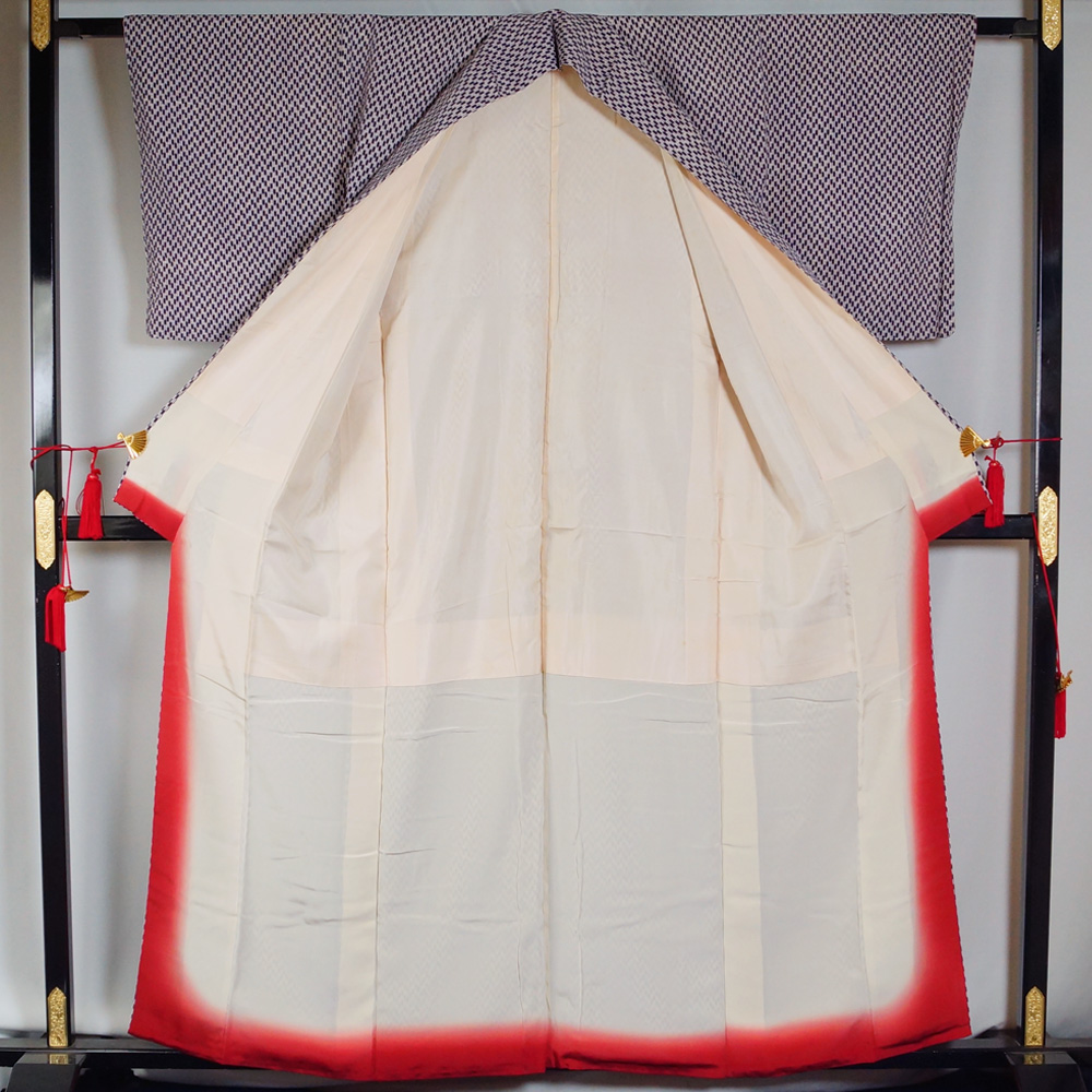 | 商品 説明 | 乳白色系のちりめん地に、深紫色系の矢羽根模様が染められた小紋です。 |