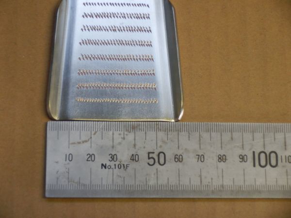 | カタログ撮影や見本市の展示などに使用するため開封しましたが 現品は未使用品です ※外箱についても商品タグのシールを剥がした跡が残っている 場合もあります。 ◎新潟県燕市の職人さんが一つ一つ丁寧に造っています。 ◎純銅製のおろし金です。ステンやアルミのおろし金と違って同じ 金属でも銅は比較的柔らかいので 素材を痛めにくく、美味しく おろすことができます。 ◎両面に目立が施されているので、お好みによって目の粗さを調整 できます。 (粗い・細かいと使い分けできます) ◎7号サイズでは全長120ミリで、おろす部分は長さ63ミリ 幅は52ミリ~44ミリになります。 | ||