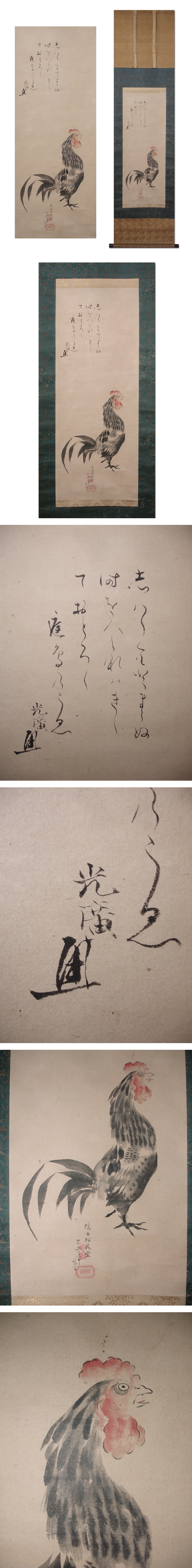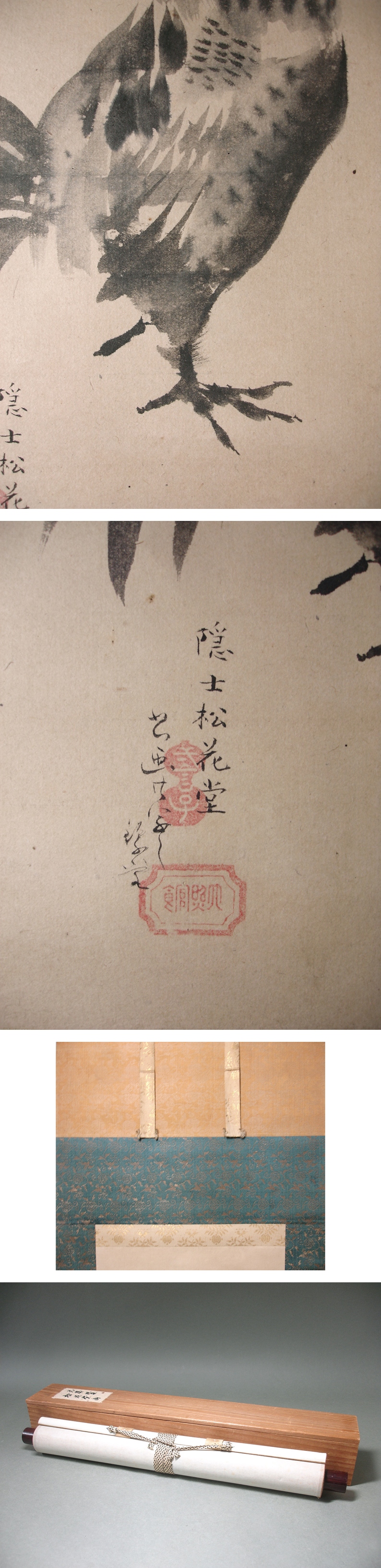 本物保証!           真言宗の僧侶出身で、書道、絵画、和歌、茶道等多岐に渡る文芸に秀でて非凡な才能を発揮し、特に書においては松花堂流という書風を大成して、近衛信尹・本阿弥光悦と共に「寛永の三筆」と称せられた、江戸前期を代表する一流文化人であり茶人【松花堂昭乗】(1582-1639)の筆と伝わる鶏図です。        紙本淡彩。         落款に「隠士」とあることから、瀧本坊の住職を後進に譲り、自らは隠棲した最晩年期の作と考察されます。          上部に書かれている賛は江戸時代前期の名高き公卿・歌人・能書家【烏丸光廣】の筆です。