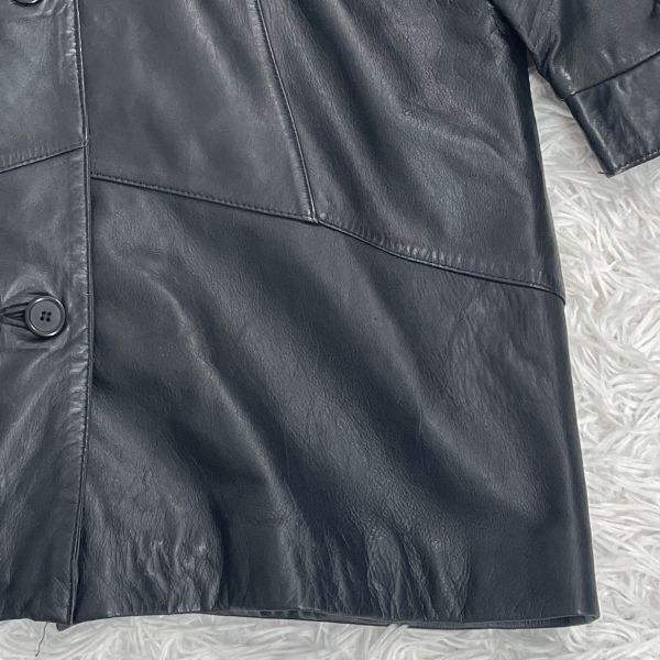 上質な羊革を使用したブラックレザージャケットです。 柔らかくしなやかな質感で、自然なツヤがあり高級感のある仕上がり。 ゆとりのあるシルエットと大きめのボタンがクラシカルな印象を演出します。 裏地はナイロンとアセテートの混紡で、滑らかな着心地。 軽やかな着用感で、季節の変わり目のアウターとしても活躍します。