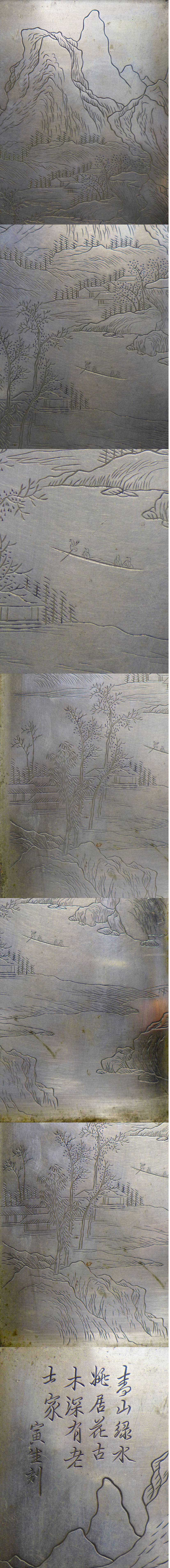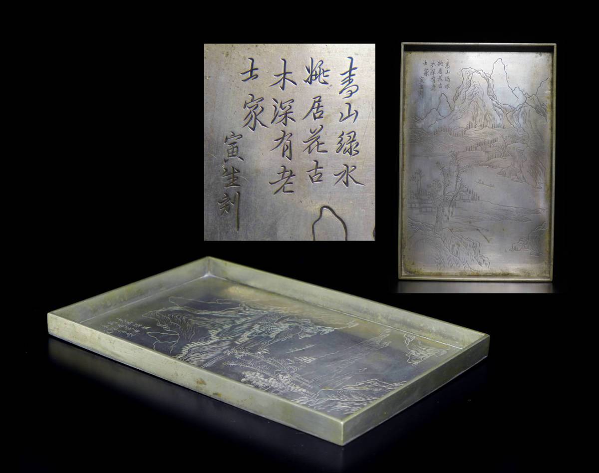 中国古玩 唐物 白銅 寅生銘 青緑山水図刻四方盆 香盆 検/墨盒文房具煎茶道具墨合