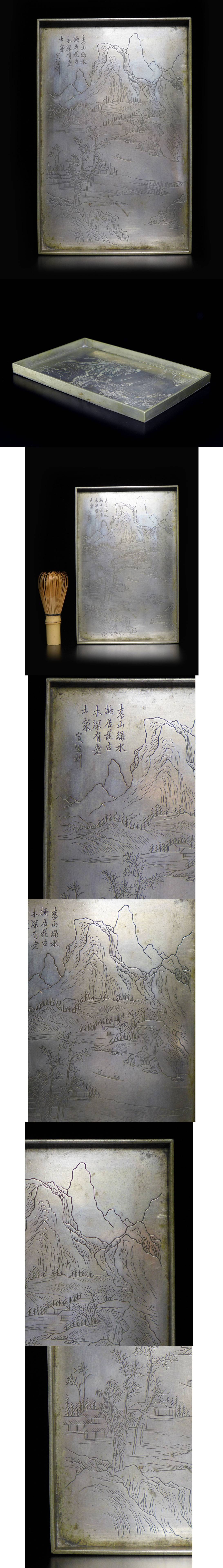 中国古玩 唐物 白銅 寅生銘 青緑山水図刻四方盆 香盆 検/墨盒文房具煎茶道具墨合 收藏