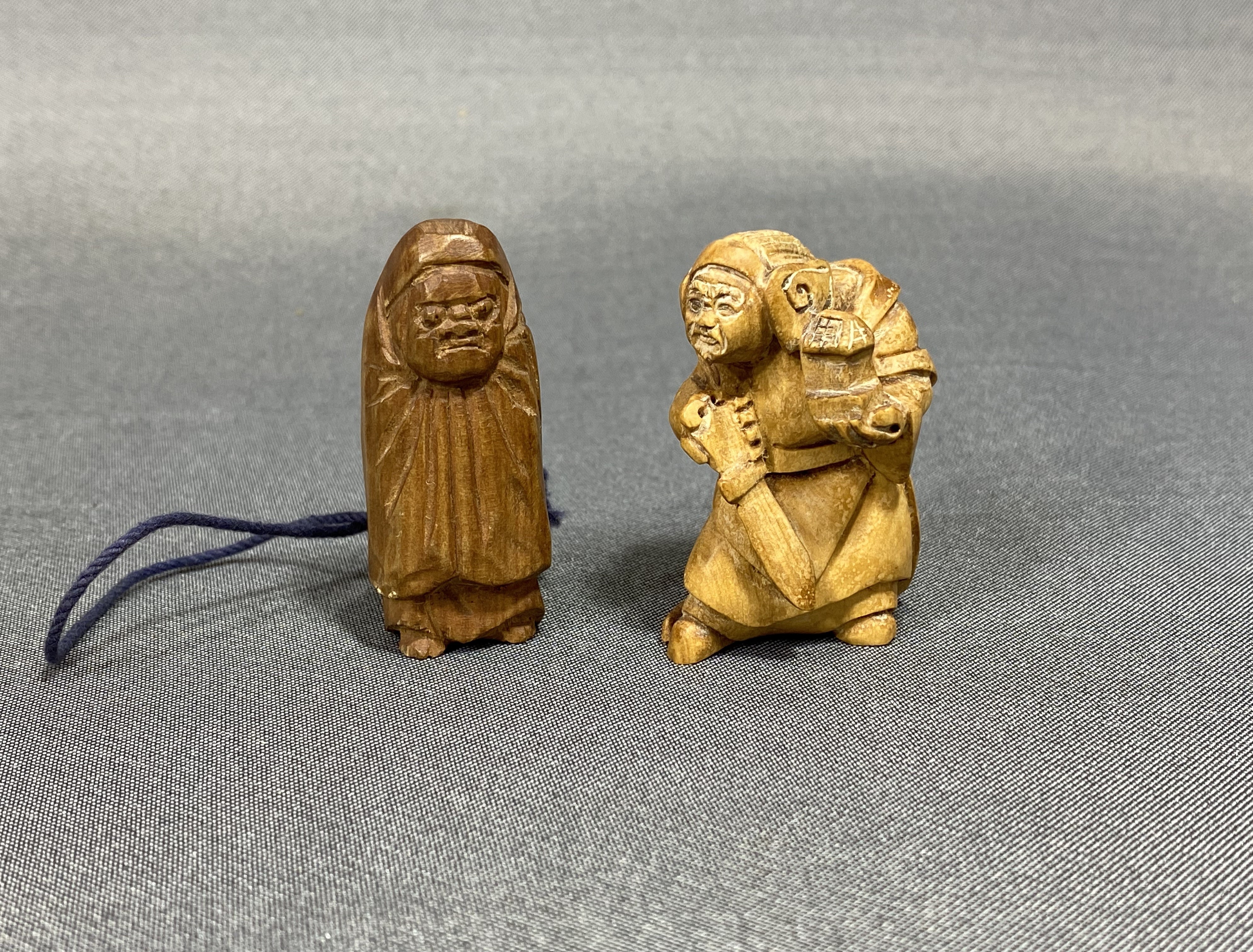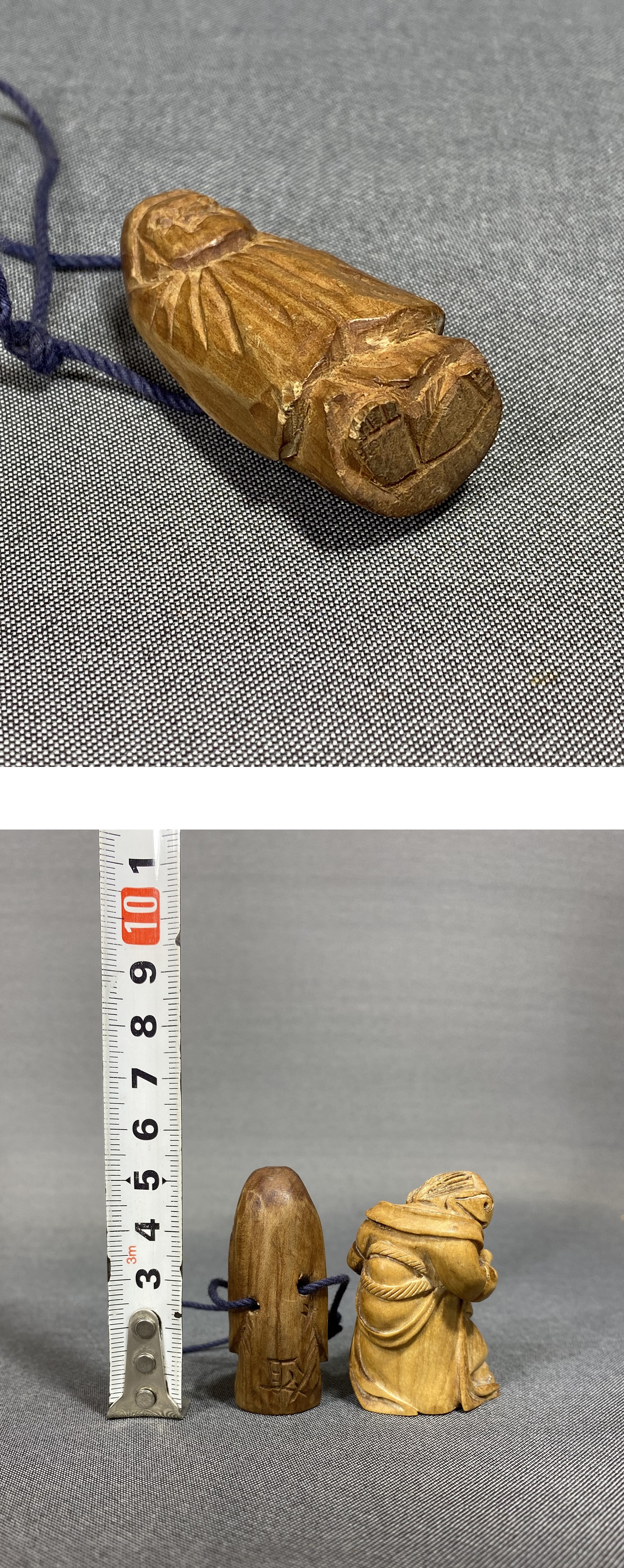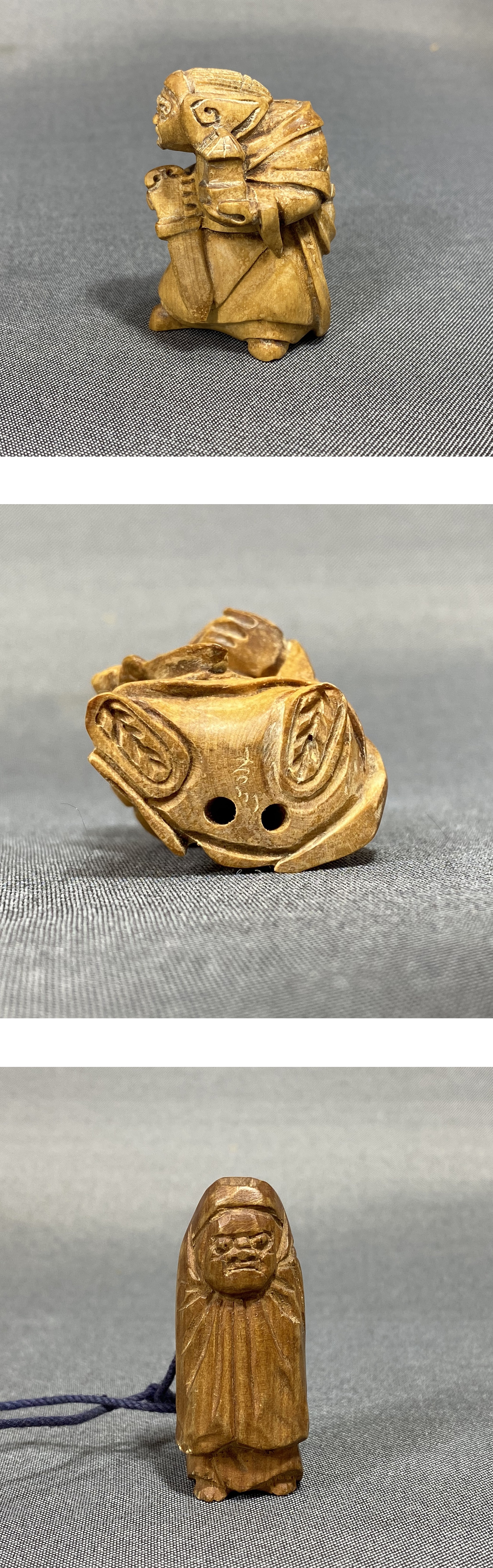 【風車】 吉川刀 木彫 天王 達磨 根付2点 ▲在銘 黄楊木 茶道具▲秀逸作 收藏