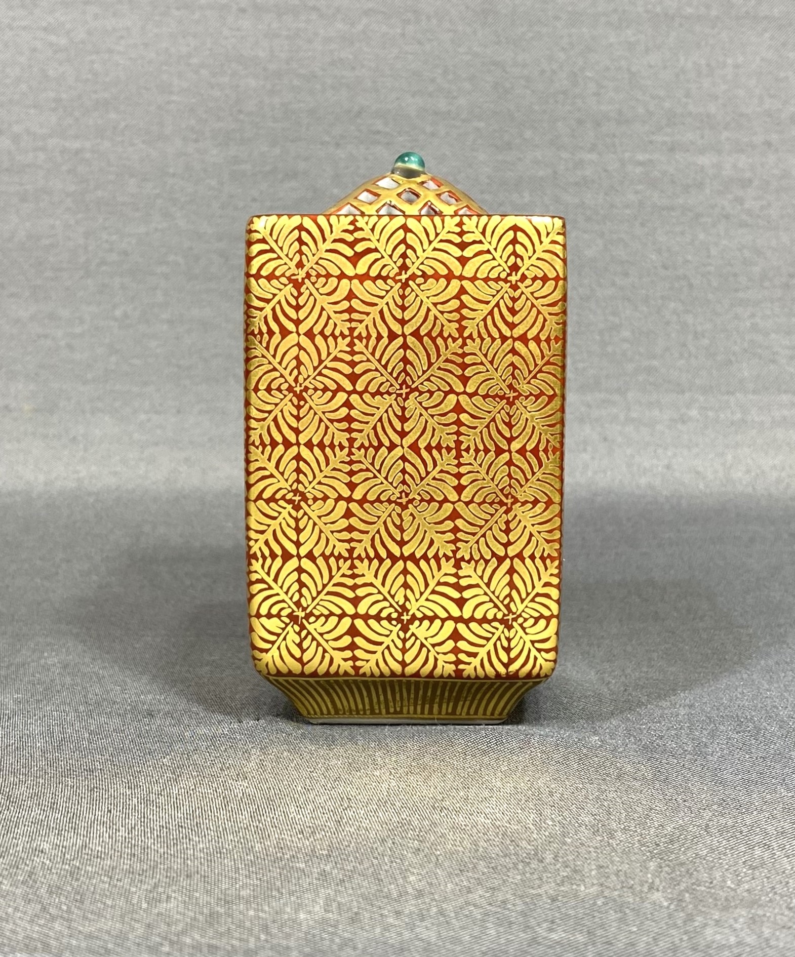 【風車】 人間国宝 九谷焼 中田一於(和雄) 赤絵 金彩 花葉文 透彫網形蓋 四角香炉▲金襴手▲色絵金彩 收藏