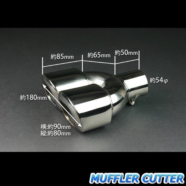 サビに強いステンレス製で丁寧に磨き上げた鏡面加工です。形状は、出口が縦約80mm,横約90mmのスクエア2本出しです。マフラーカッターの出口部分の最大取付幅は約180mmです。