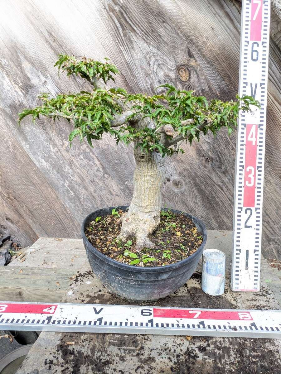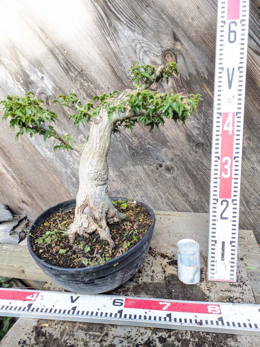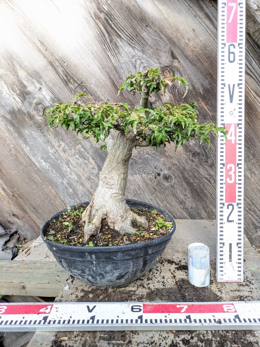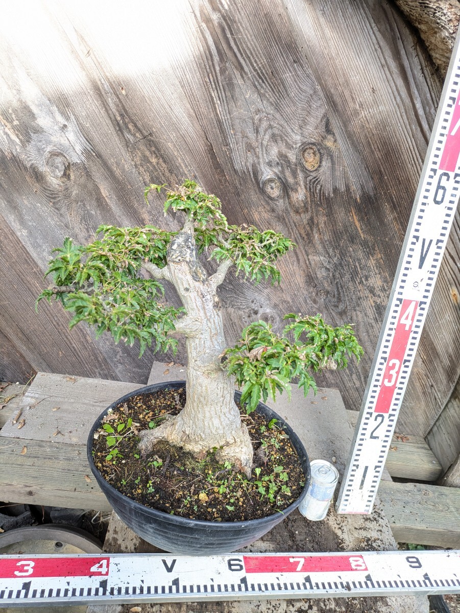 およそは40x40x52cmの枠に入るサイズ。根本付近からの高さは37cmくらい。長年のプラ鉢で老朽化してます。主幹をバッサリ切って胴吹き芽でコンパクトにしている木です。肉乗りは徐々くらい擁護材を塗ってます。発送梱包の際に痛むヶ所が有るかもしれません。佐川急便にて発送する事も有ります。