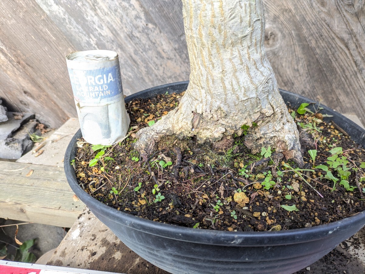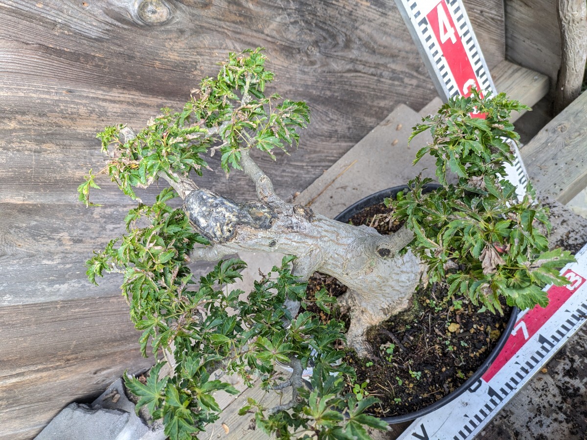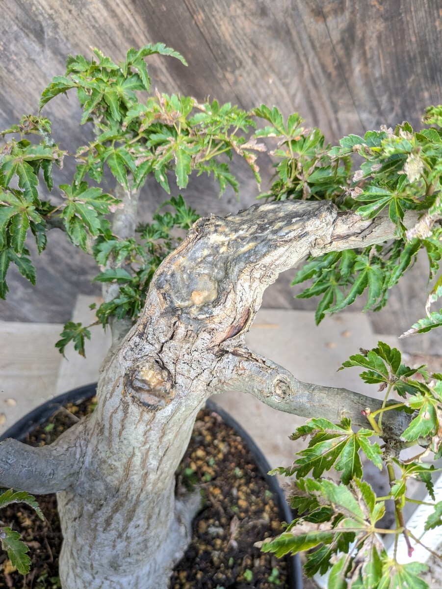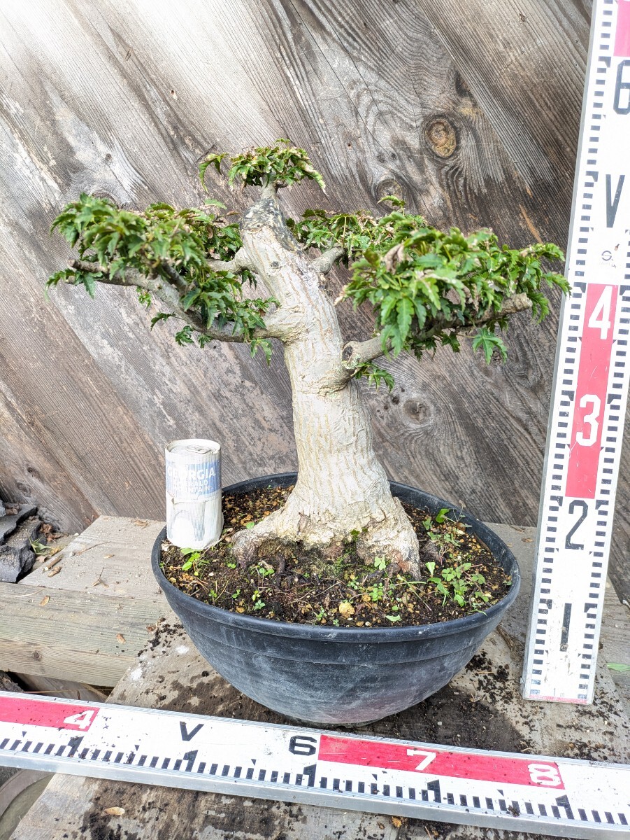 およそは40x40x52cmの枠に入るサイズ。根本付近からの高さは37cmくらい。長年のプラ鉢で老朽化してます。主幹をバッサリ切って胴吹き芽でコンパクトにしている木です。肉乗りは徐々くらい擁護材を塗ってます。発送梱包の際に痛むヶ所が有るかもしれません。佐川急便にて発送する事も有ります。