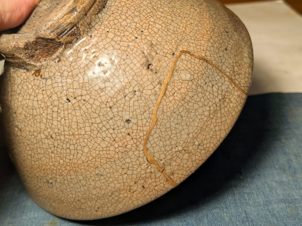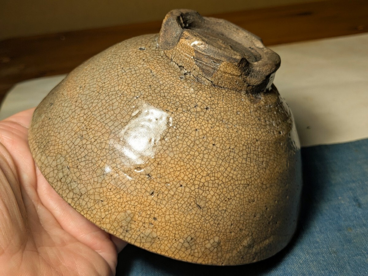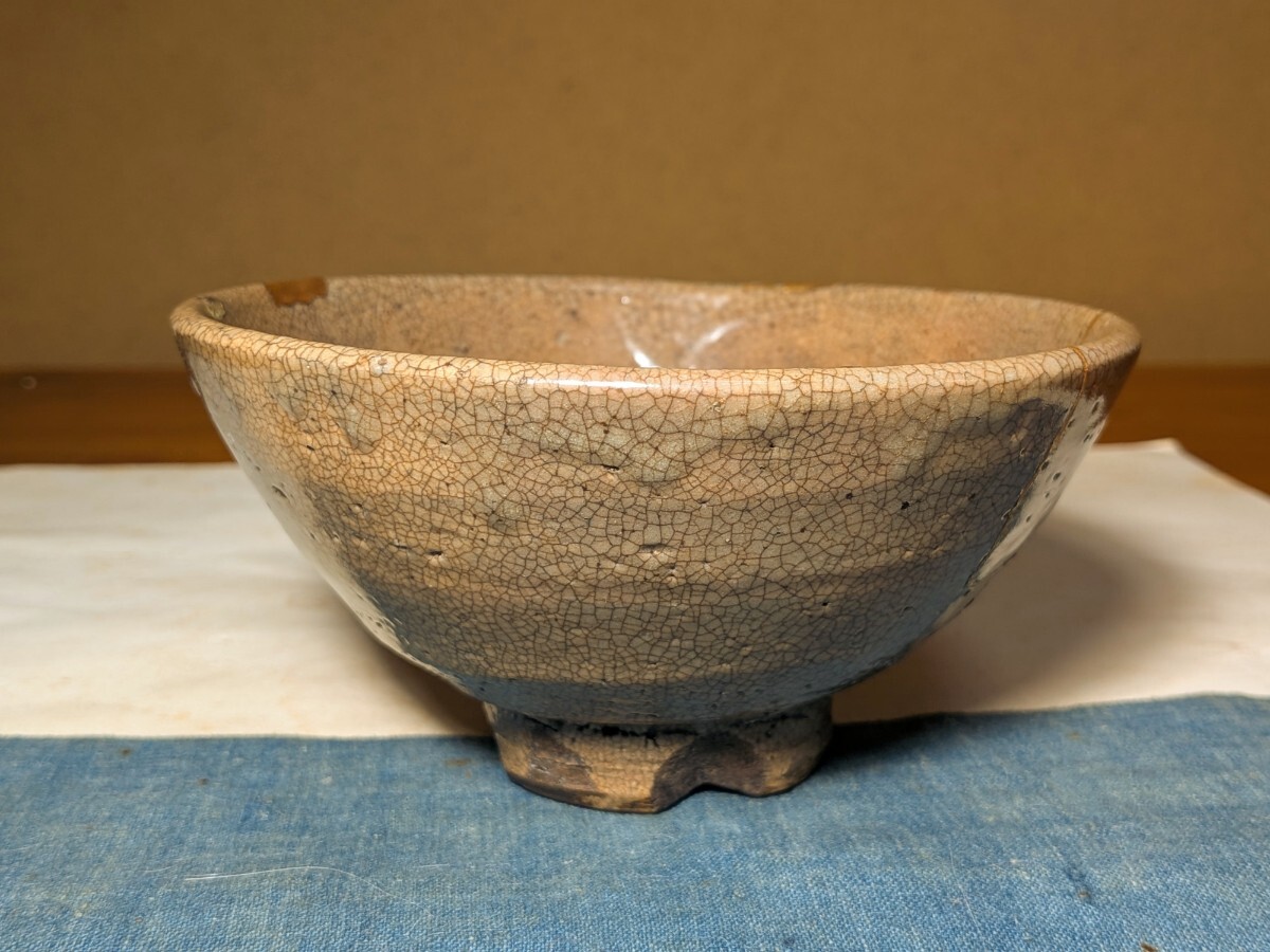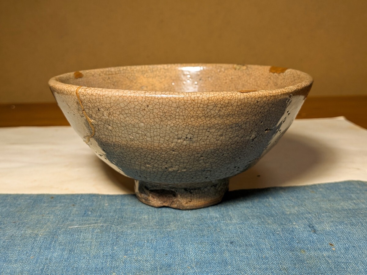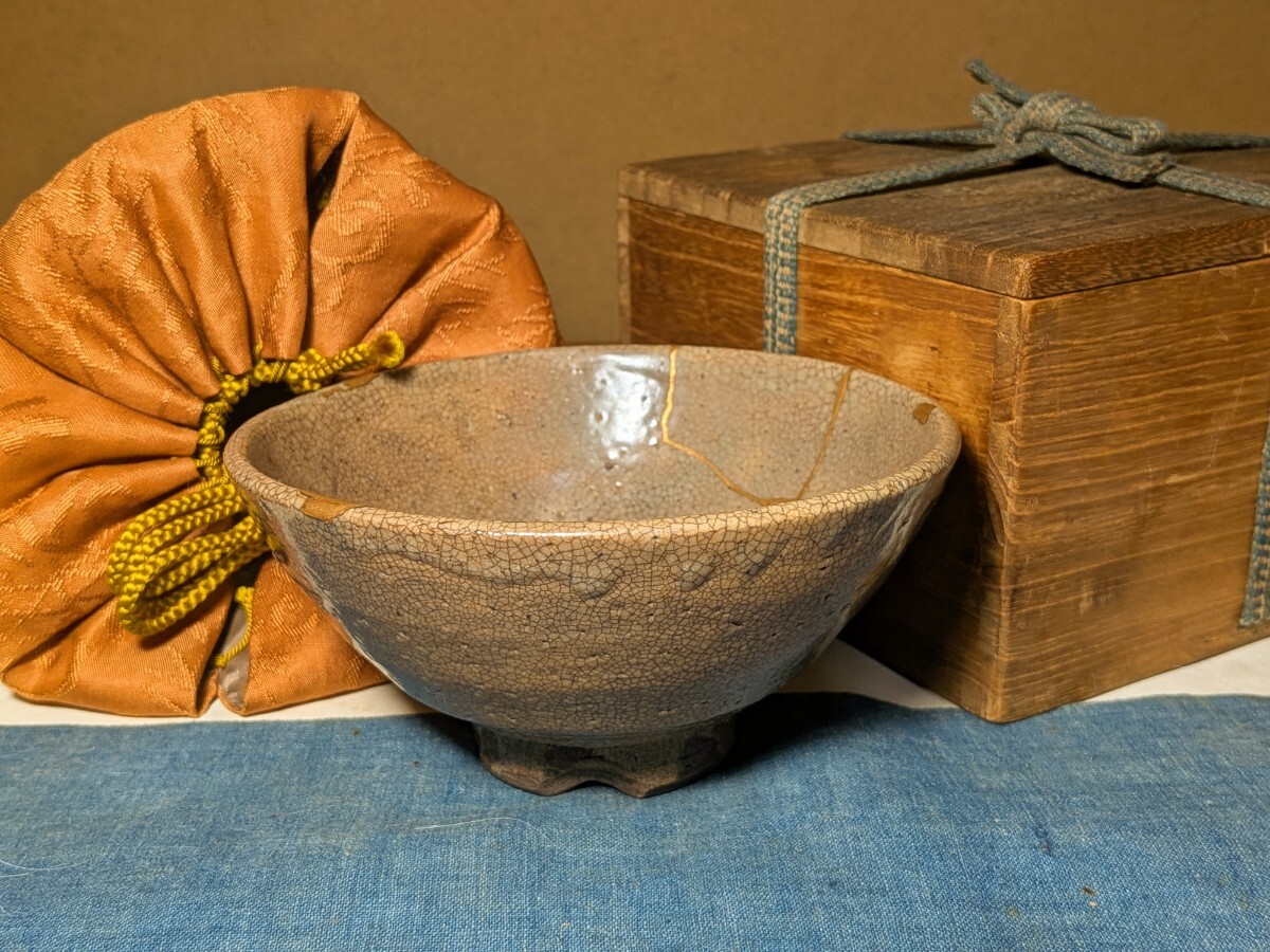 李朝の井戸堅手の茶碗です。枇杷色、陶器質、貫入味、高めの高台、高台横の箆削り、轆轤目など井戸の要素を多く備えています。箱には井戸茶碗と記されています。井戸の要素の多い茶碗を井戸脇と称するのが普通ですが、井戸茶碗に先行する土目痕や器形等から井戸堅手と言った方がしっくりきます。高台に目土を外した際の削げ、縁に共割れの金継ぎ、ほつれの金直しが4カ所(1カ所直しが取れています)あります。秋の夜長にじっくりとお茶を堪能していただきたい味わい深い李朝井戸堅手茶碗を特別出品です。箱、仕覆(底部の径が違うので合わせと思います)あり。・口径14〜14.2センチ・高さ6.8〜7.1センチ・李朝前期 ※新規の方、評価の悪い方の入札は取り消す場合があります。商品到着後は速やかに取引ナビの受取連絡を入れて下さい。