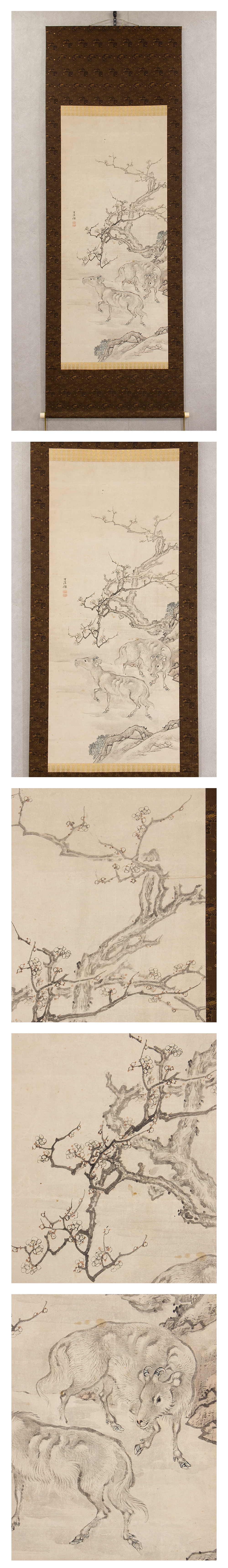【模写】在銘 時代画 山羊図 掛軸 合せ箱 水墨画 古画 收藏