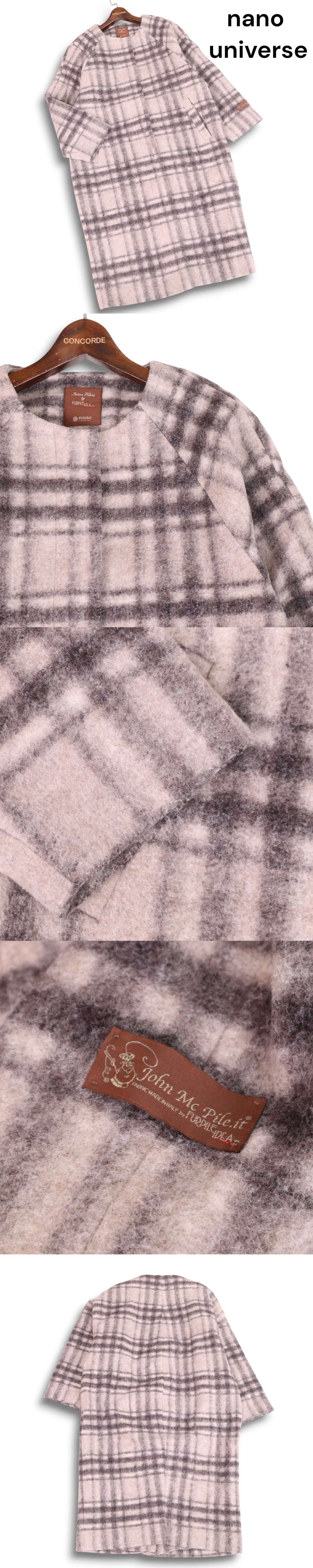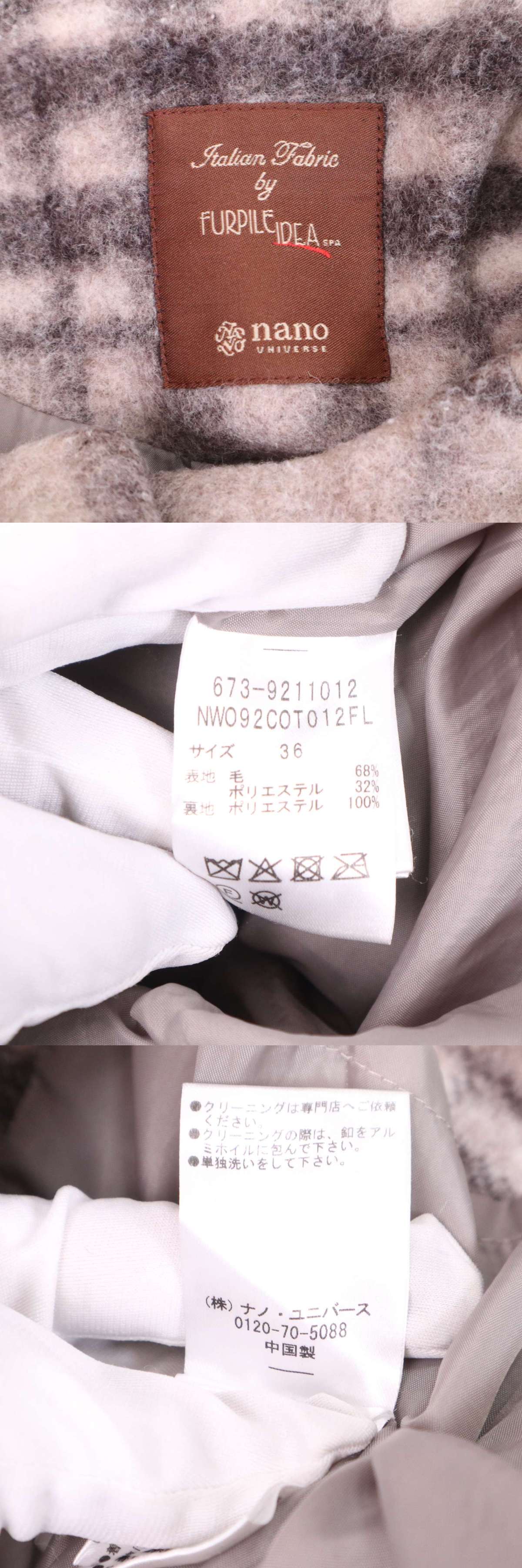 nano universe ナノユニバース 秋冬★ イタリア製生地 ウール チェック ノーカラー ロング コート Sz.36 レディース 收藏