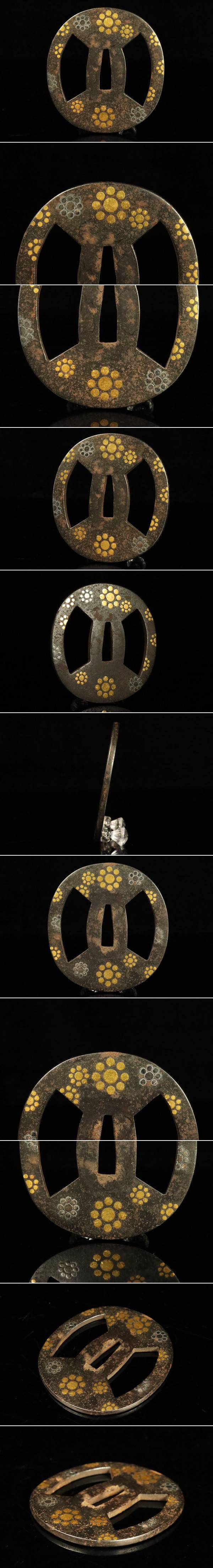 【ASAHI】肥後鐔 無銘 鉄地金象嵌九曜紋家紋入丸型鍔 肥後の名品 武具 刀装具[71162q] 收藏