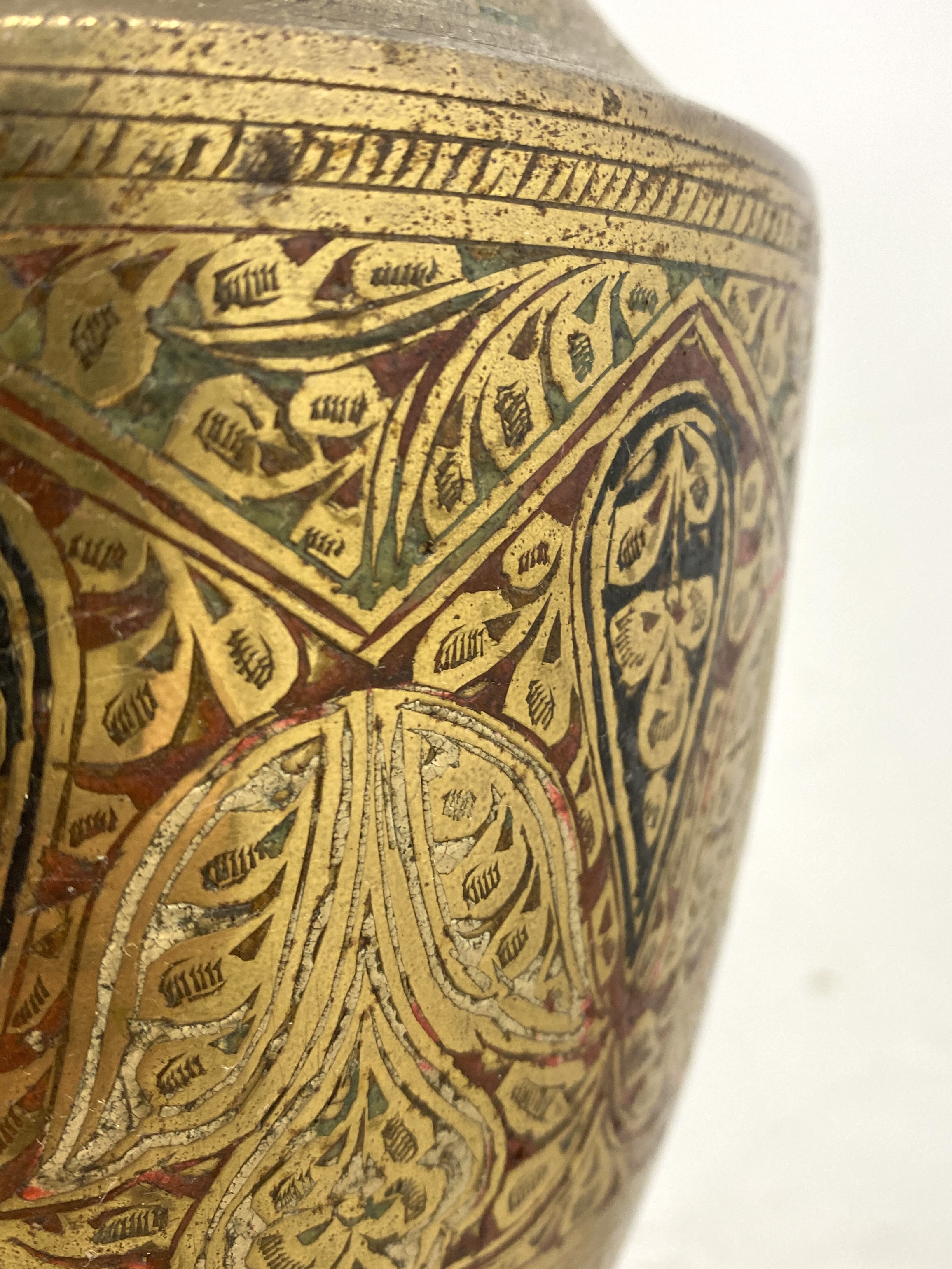 ベースはおそらく真鍮製。表面に植物モチーフが彫刻され、赤、緑の塗料で装飾されています。
