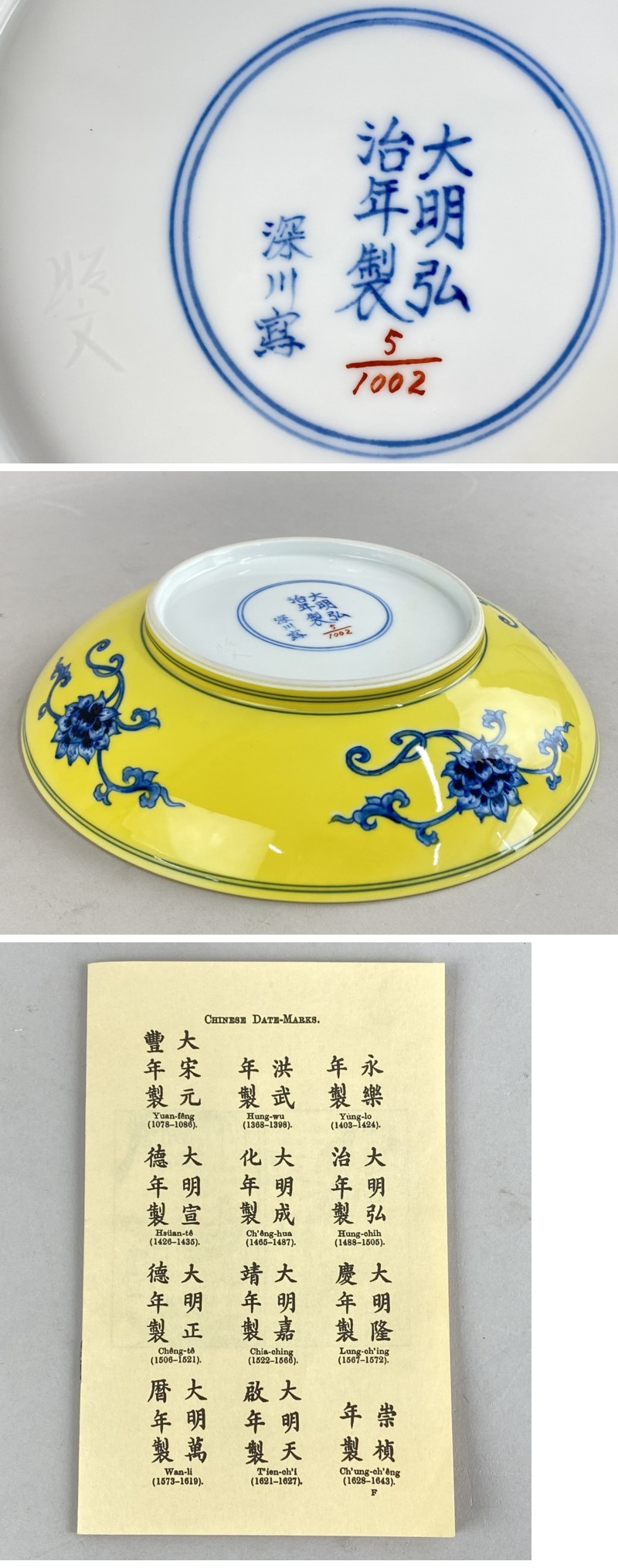 i1949 深川製磁 限定 5/1002 明瓷コレクション 伝統工芸士 村島昭文 皿 黄地青花紋 直径26cm 飾り皿 有田焼 收藏