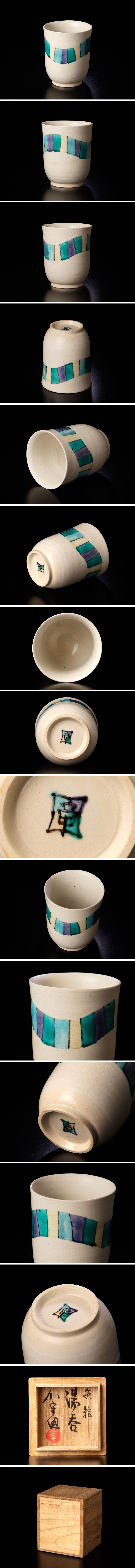 49歳という若さで生涯を閉じ、伝説の陶芸家として現在も孤高の評価を受ける名工、加守田章二。 氏の独自性が際立つ、美しい湯呑です。 象牙色の柔らかな地肌に、緑青・青・紫を基調とした色面が帯状に連なり、まるで抽象絵画の一部を切り取ったかのようなリズム感を生み出しています。 静かでありながらも力強い存在感を放ちます。 ★商品は加守田章二の作品である事を保証致します。 |
