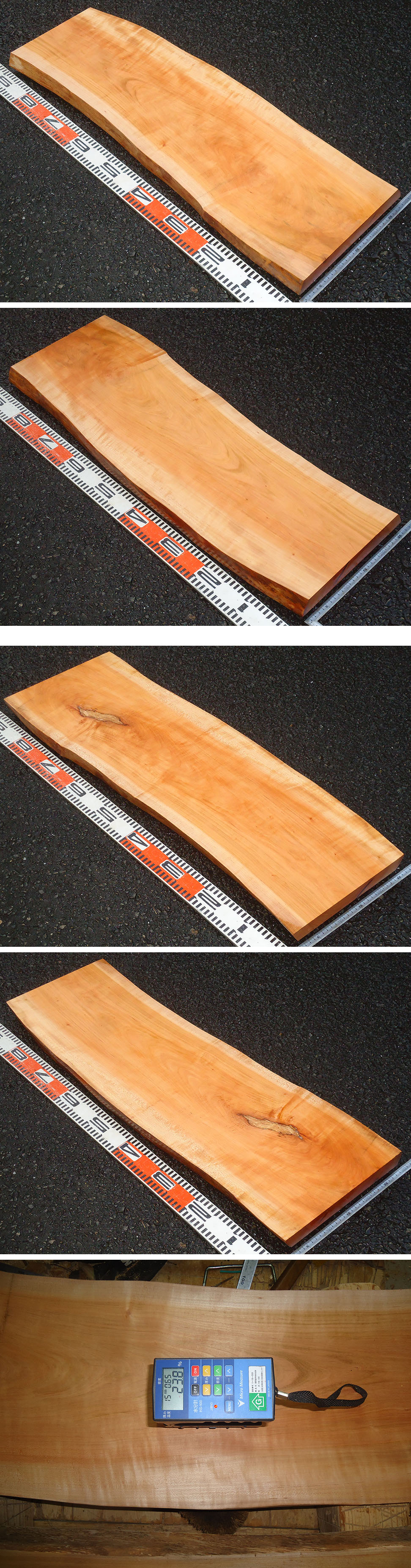 ・表面はほぼ無節、飴色に上品な杢目が美しい素材です。通常の山桜よりやや硬質な印象です。