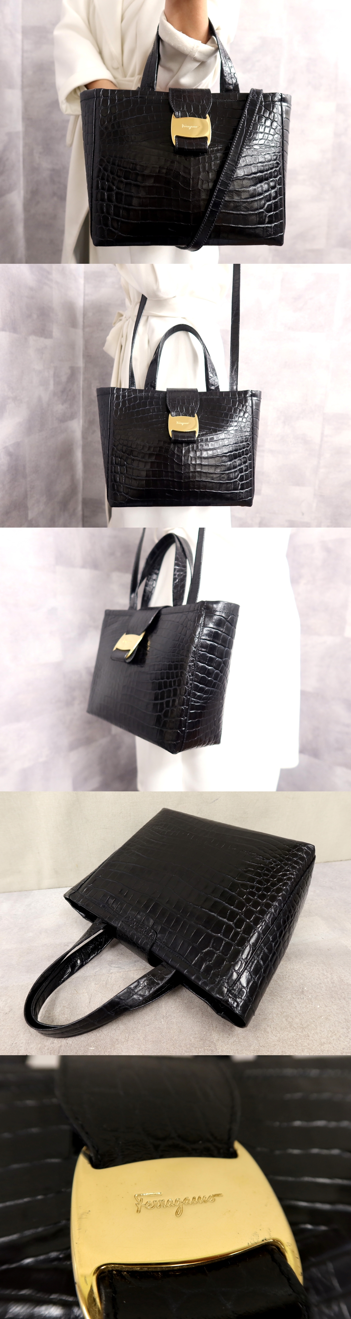 ●超美品●Salvatore Ferragamo フェラガモ●ヴァラ●クロコダイル 型押し レザー 本革●2way ハンド バッグ●ネイビー●B5 収納●Js63527 收藏