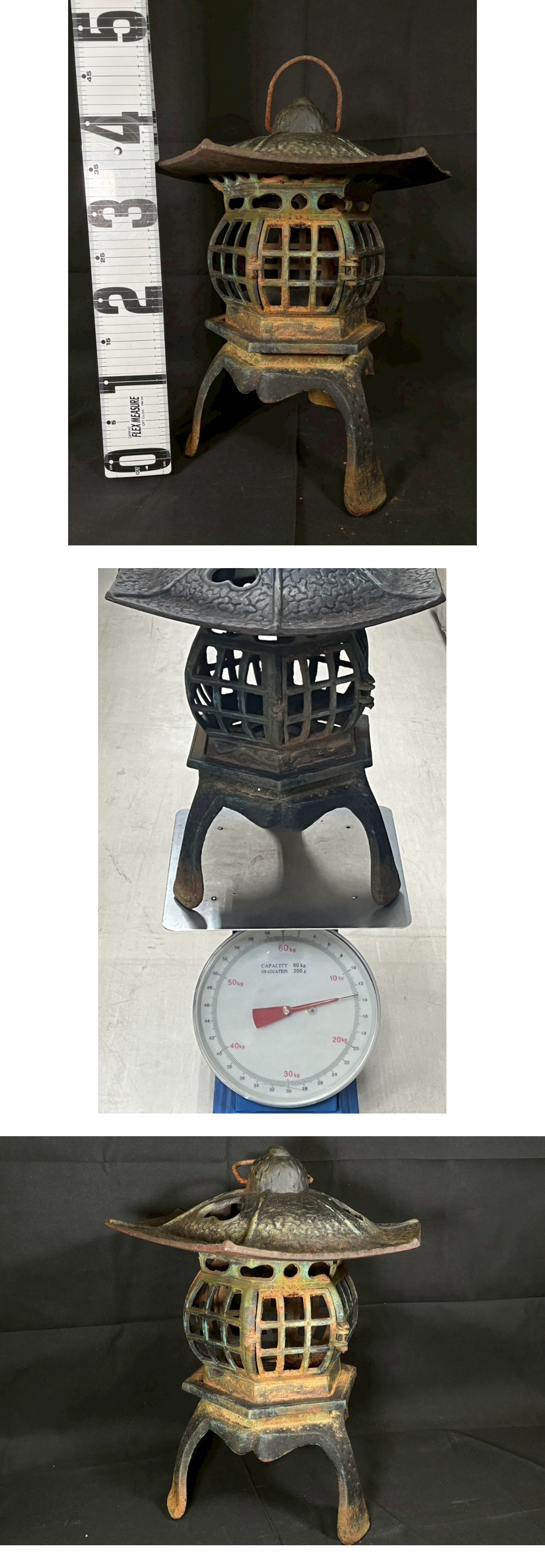 ●【蔵出】鉄製 灯篭 高さ約54cm 重さ13.2kg 吊り灯篭 置き灯篭 六角 庭園 置物 古民具 骨董 古美術 アンティーク 重厚 時代物 ■サイズ:横幅 43cm/高さ 54cm ■重量: 13.2kg ※素人寸法の為、若干の誤差はご了承ください。 ■状態につきましては経年に伴うスレ・汚れ・小キズ などが見られます。 ※その他の細かな状態は写真にてご確認・ご了承の上 ご入札くださいませ。 ●こちらの商品などは時代物や古いお品・骨董品となり ますので、細かな状態を気にされる方・神経質な方の ご入札はご遠慮くださいませ。 |