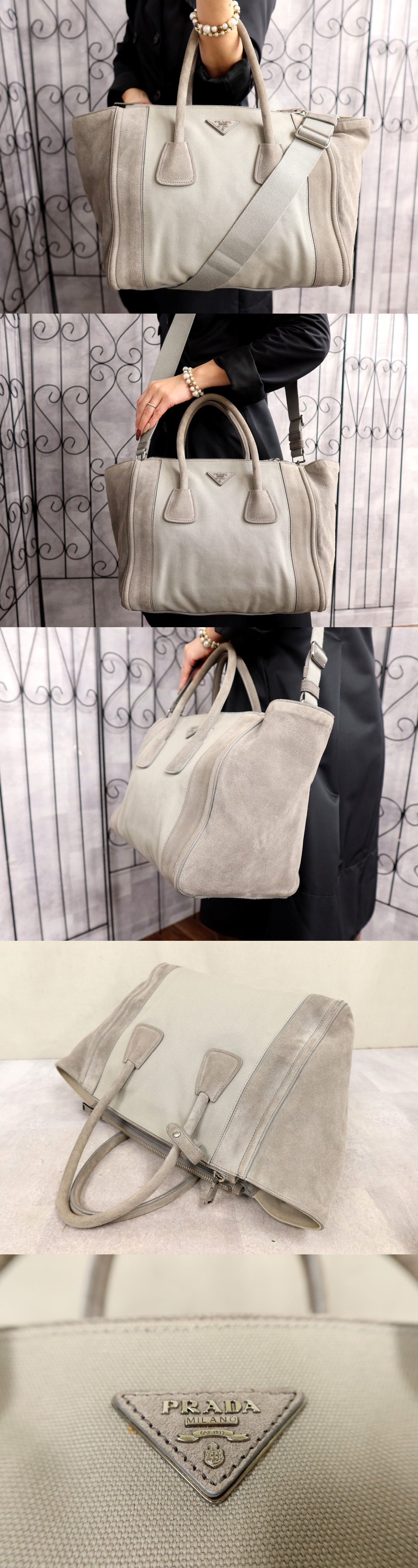 ●超美品●PRADA プラダ●三角ロゴプレート●キャンバス スエード レザー 本革●2way トート バッグ●グレー●腕掛け●A4 かばん●Js64247 收藏
