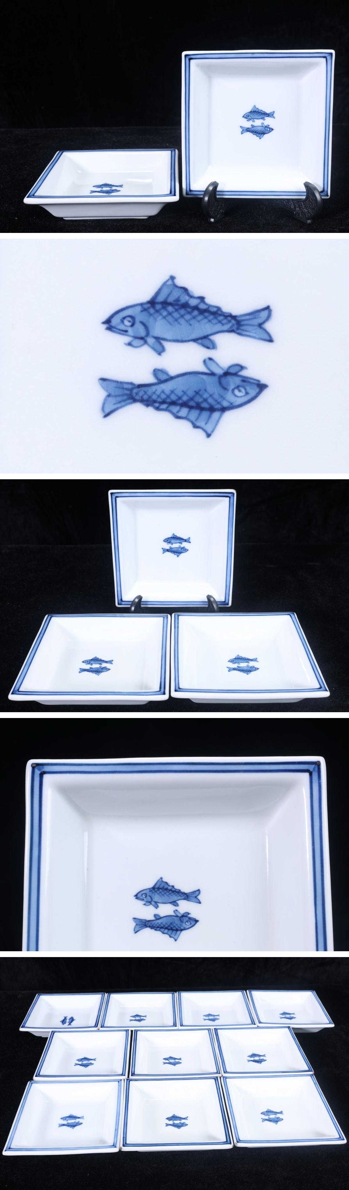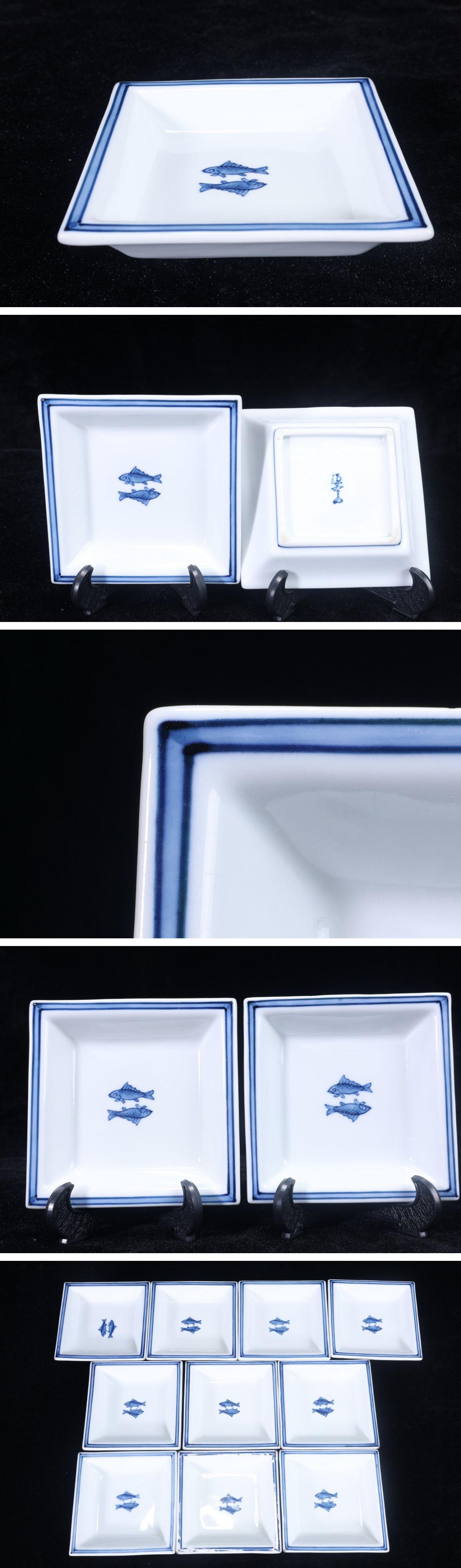 【珍品堂】1円から V38-N12 有田焼 館林源右衛門窯 古伊万里 双魚紋 染付 小皿 10枚 角皿 正方形 名窯 和食器 懐石 時代物 古美術 時代物 收藏