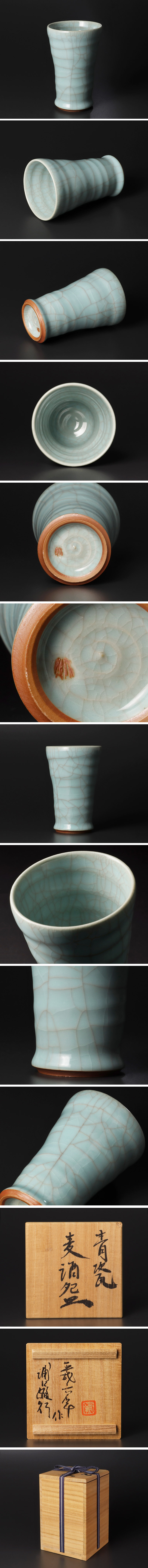 青磁の澄んだ色調に気品が漂い、手に馴染むやさしさを感じさせます。やや波打つ造形も相まって、味わい深い作品です。 ★商品は浦口雅行の作品である事を保証致します。 |