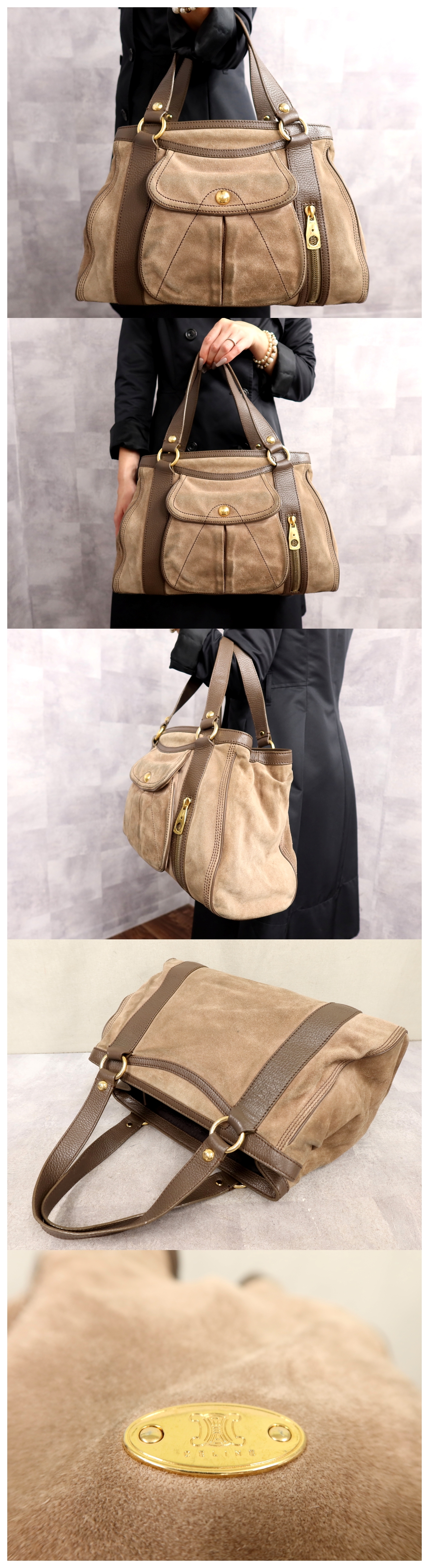 美品●CELINE セリーヌ●ロゴプレート●スエード カーフ レザー 本革●ハンド トート バッグ●ブラウン系●ゴールド金具●A4 収納●Js64572 收藏