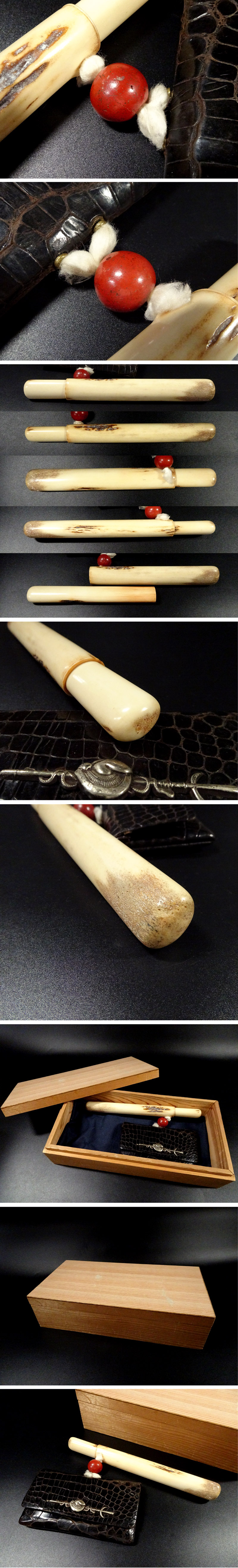敬逢 時代 提物 鰐皮 本クロコ革造 兜に十文字槍図 銀無垢金具 煙草入れ 鹿角造煙管筒 蜻蛉玉大玉緒〆 TAB-6 收藏