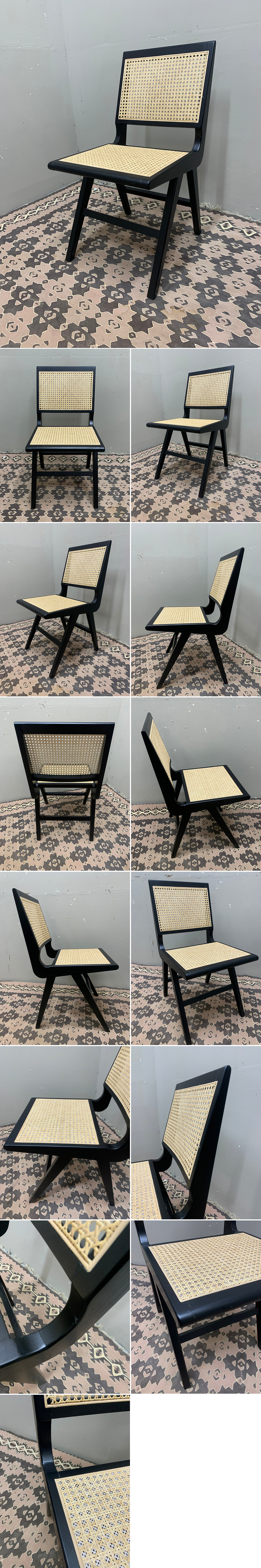 黒色の木製フレームと、天然素材である籐(ラタン)の座面・背もたれを組み合わせたスタイリッシュなダイニングチェアです。 |