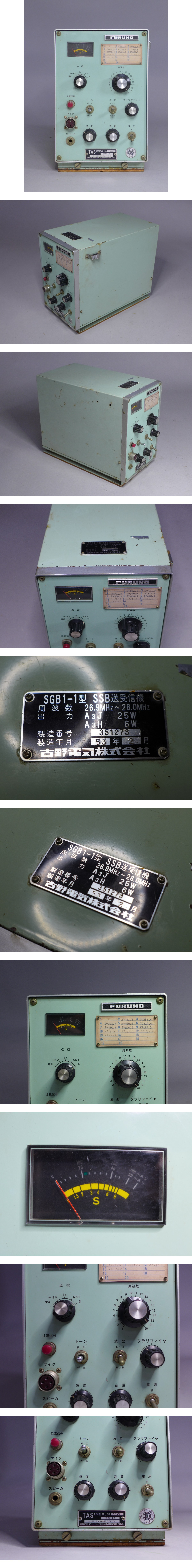 FURUNO SGB1-1型 SSB送受信機 現状品です。当方このような物に詳しくない為に詳細などは分かりかねます。状態は画像参照でお願いします。作動確認は出来ておりません。その他不明の為ジャンク品となります。◇古い電気製品の為、必ず整備の上安全を確認してからご使用下さい。簡単に掃除はしておりますが古い物の為、埃汚れなあります。現状品になりますので写真をご確認の上御入札お待ちしています。※他にも古い無線機関係を多数出品しております。是非ご覧ください。★★★★★★★★★★★★★★★★★★★★★★★★★最近、悪質な入札者が多く非常に迷惑をしております。新規IDや「非常に悪い・悪い」の評価の多い方の入札はお断りさせて頂きます。 仮に入札があった場合でも、発見次第入札を削除させて頂く場合がございます。